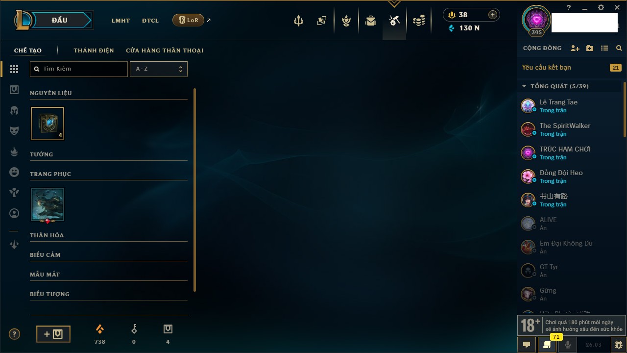Rank Đơn: Chưa Rank Khung: Chưa có khung Tướng: 172 - Còn 5086 THX Trang Phục: 563 Rank ĐTCL: Chưa Rank Linh Thú: 153