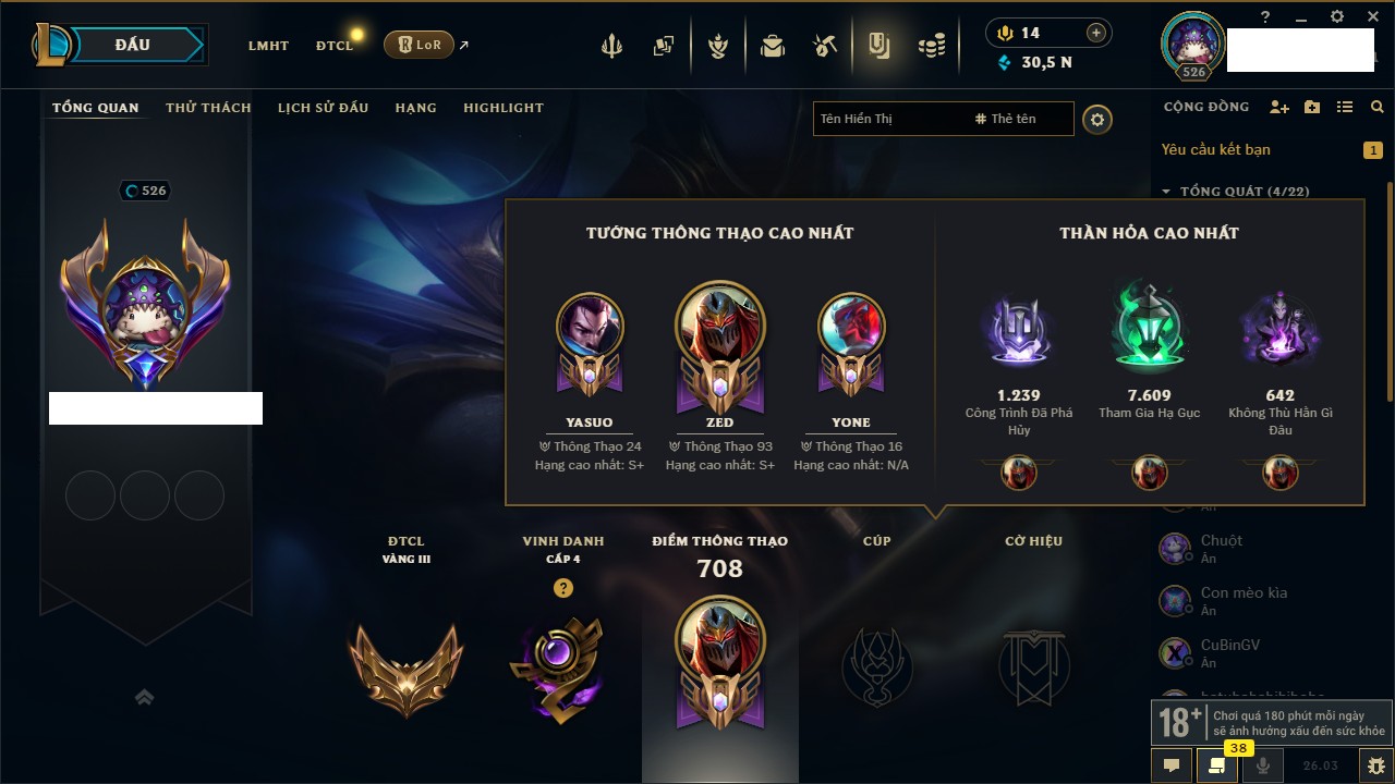 Rank Đơn: Chưa RankKhung: Chưa có khungTướng: 165 - Còn 79975 THXTrang Phục: 210Rank ĐTCL: Chưa RankLinh Thú: 149