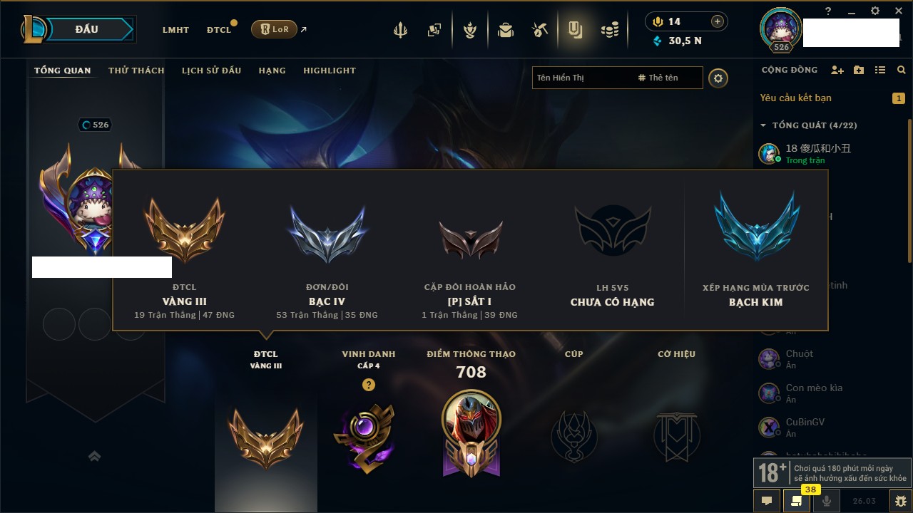 Rank Đơn: Bạc IVKhung: BạcTướng: 172 - Còn 30545 THXTrang Phục: 385Rank ĐTCL: Vàng IIILinh Thú: 163
