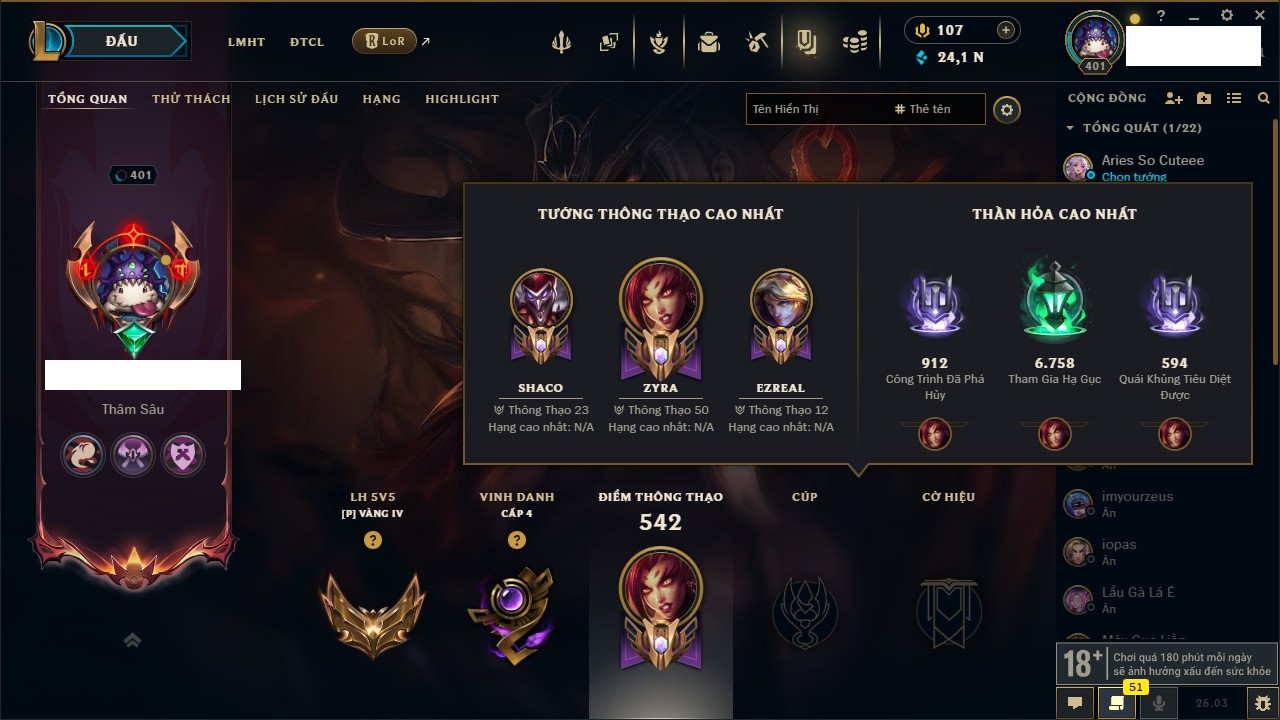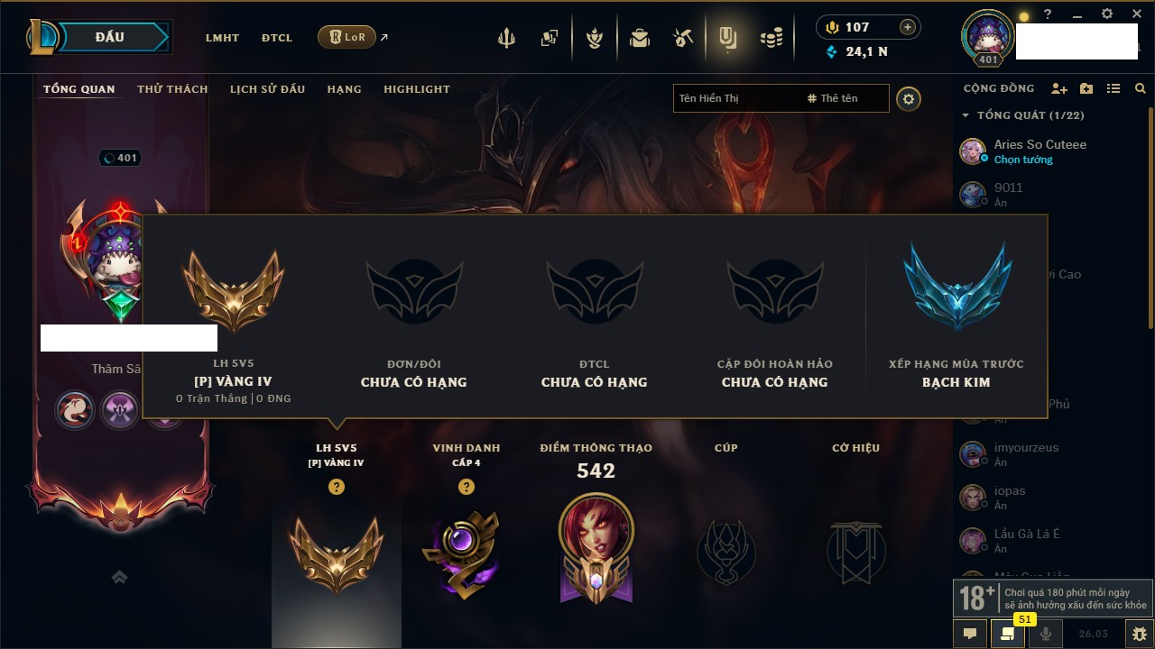 Rank Đơn: Vàng III Khung: Chưa có khung Tướng: 172 - Còn 45354 THX Trang Phục: 622 Rank ĐTCL: Chưa Rank Linh Thú: 87