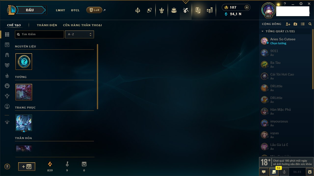 Rank Đơn: Chưa Rank Khung: Bạc Tướng: 170 - Còn 80399 THX Trang Phục: 257 Rank ĐTCL: Chưa Rank Linh Thú: 155