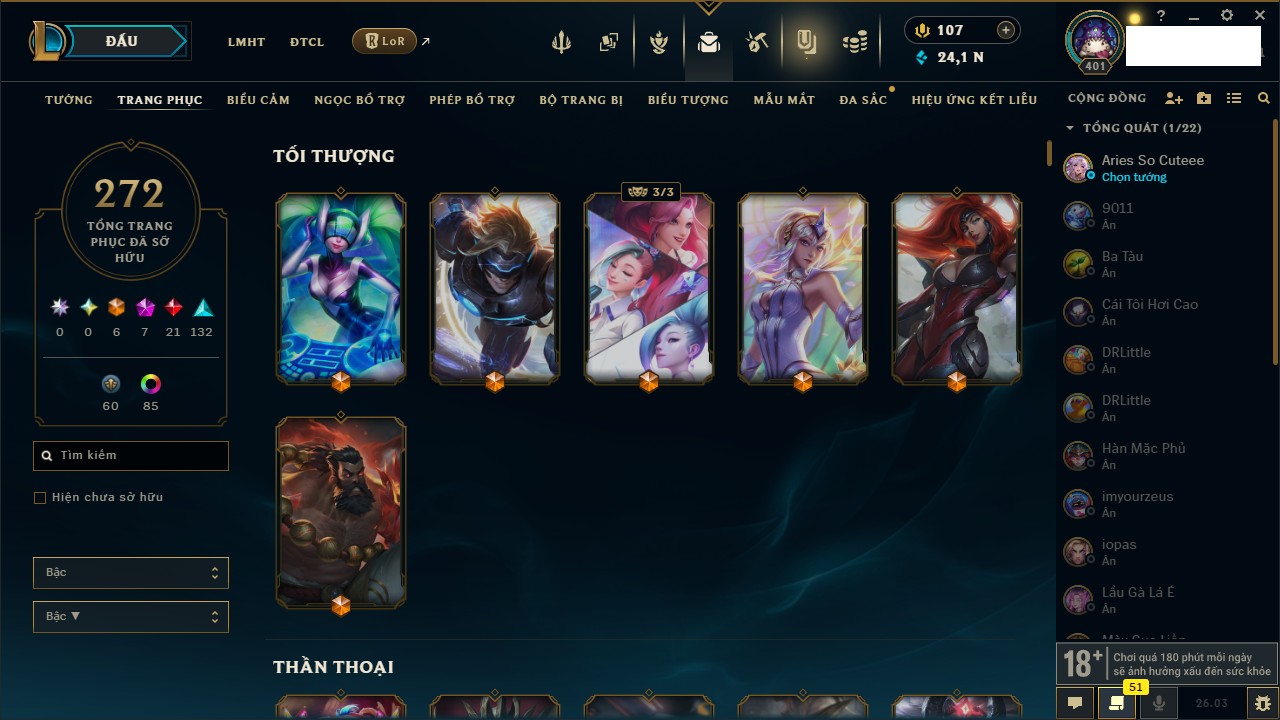 Rank Đơn: Chưa Rank Khung: Bạch kim Tướng: 172 - Còn 24164 THX Trang Phục: 272 Rank ĐTCL: Chưa Rank Linh Thú: 66