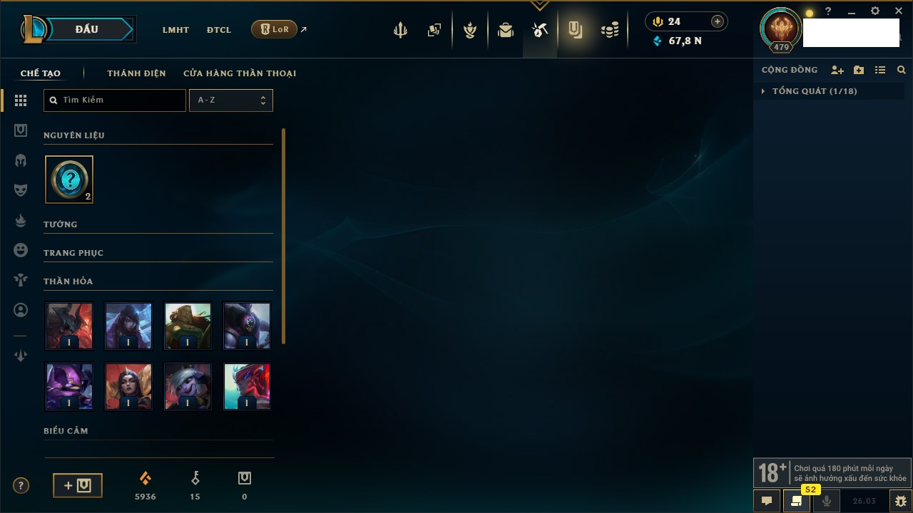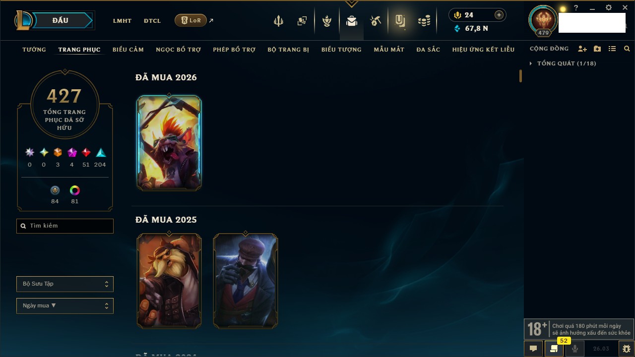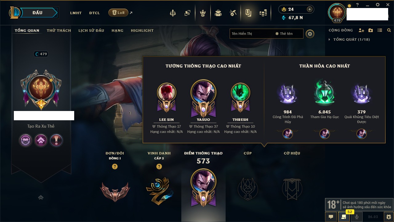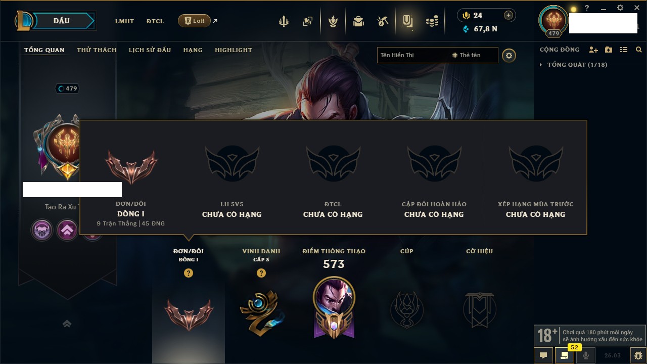 Rank Đơn: Chưa RankKhung: Bạch kimTướng: 171 - Còn 250924 THXTrang Phục: 355Rank ĐTCL: Chưa RankLinh Thú: 230