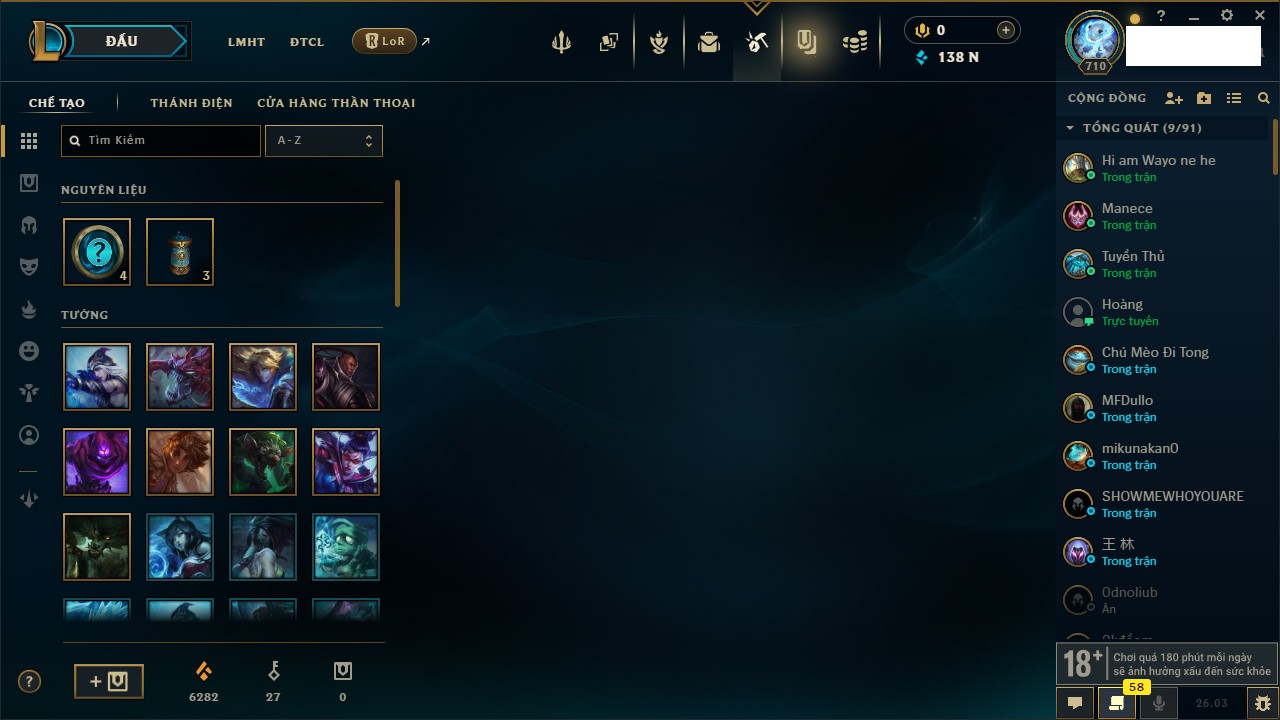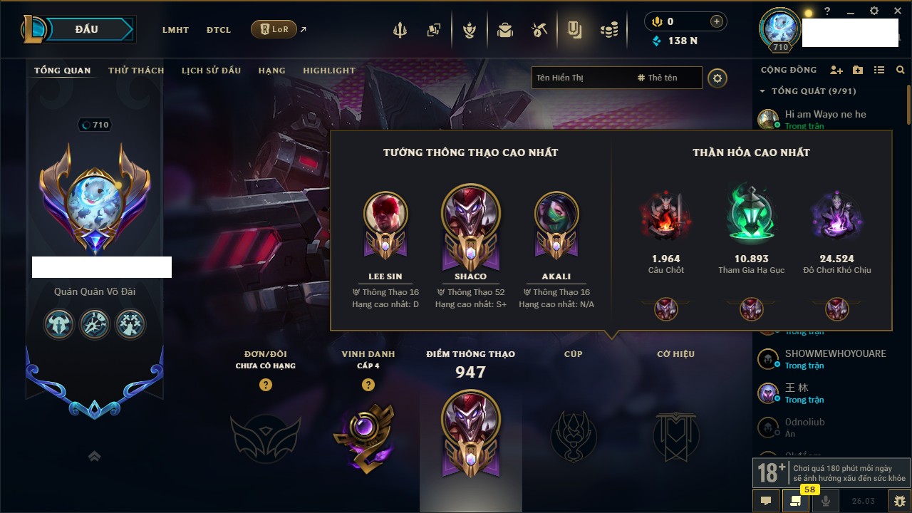 Rank Đơn: Chưa Rank Khung: Chưa có khung Tướng: 165 - Còn 1609 THX Trang Phục: 25 Rank ĐTCL: Chưa Rank Linh Thú: 44