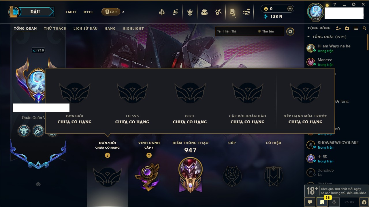 Rank Đơn: Đồng IV Khung: Chưa có khung Tướng: 172 - Còn 29179 THX Trang Phục: 390 Rank ĐTCL: Chưa Rank Linh Thú: 169