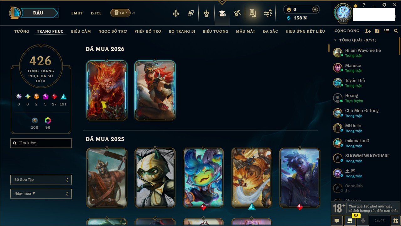 Rank Đơn: Chưa rank mùa nào Khung: Chưa có khung Tướng: 45 - Còn 3721 THX Trang Phục: 10 Rank ĐTCL: Chưa rank mùa nào Linh Thú: 135