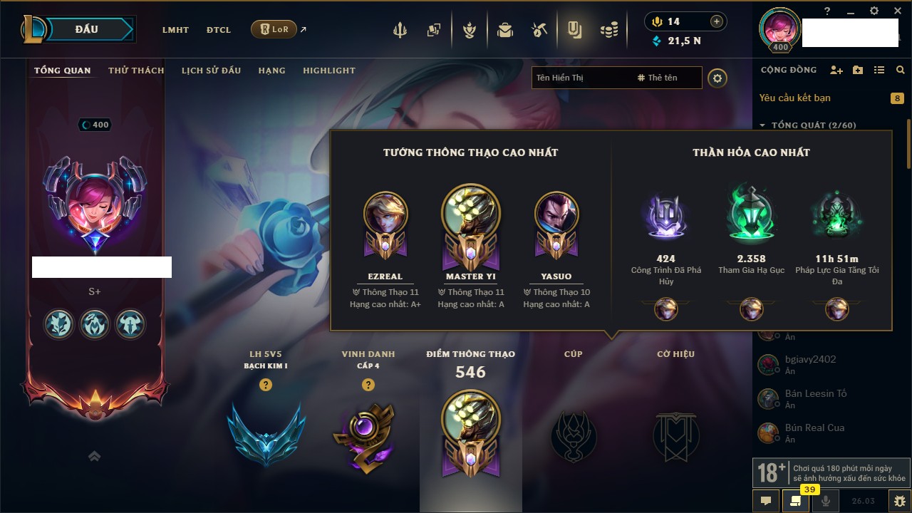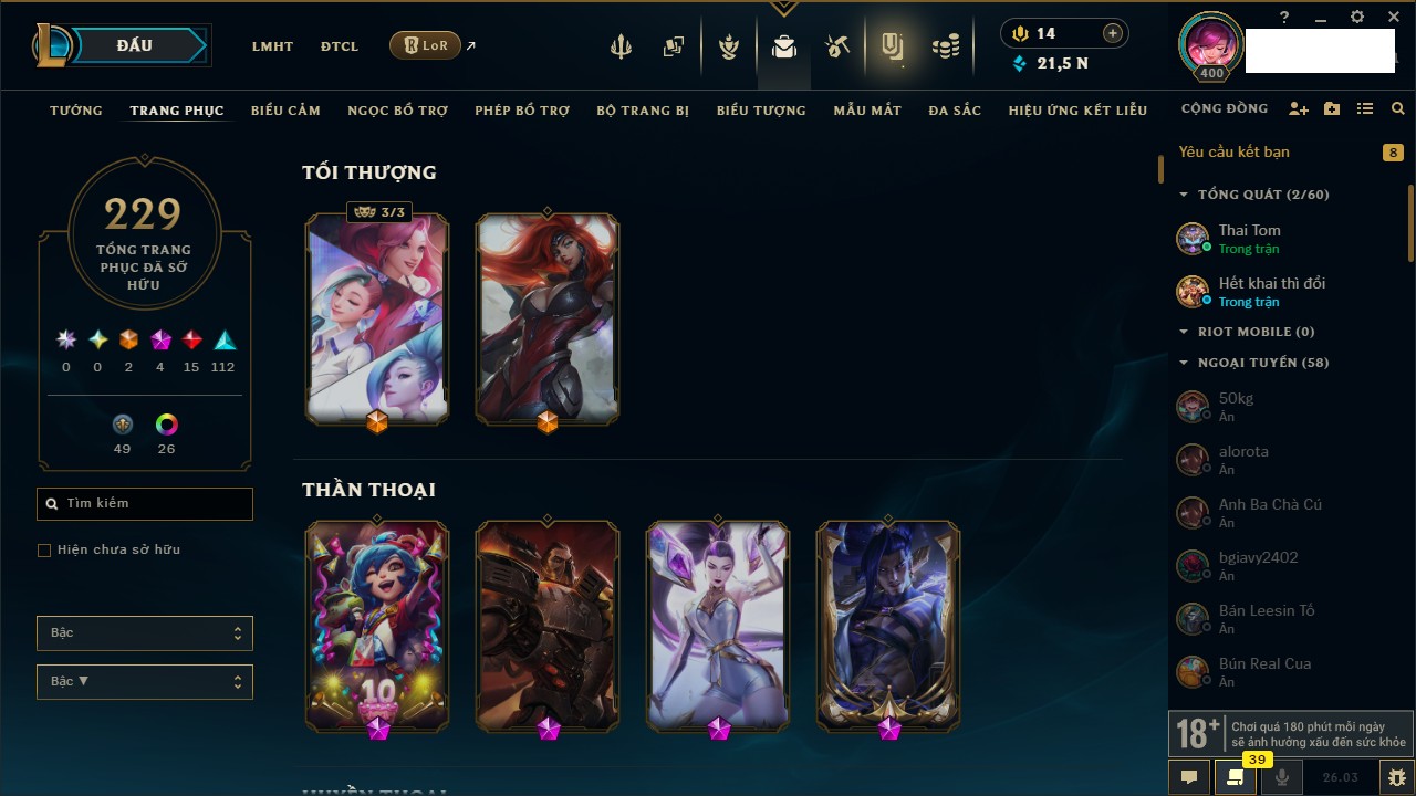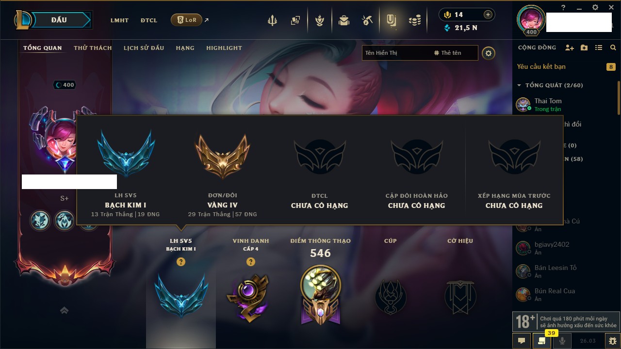 Rank Đơn: Chưa RankKhung: Bạch kimTướng: 172 - Còn 81 THXTrang Phục: 226Rank ĐTCL: Chưa RankLinh Thú: 193