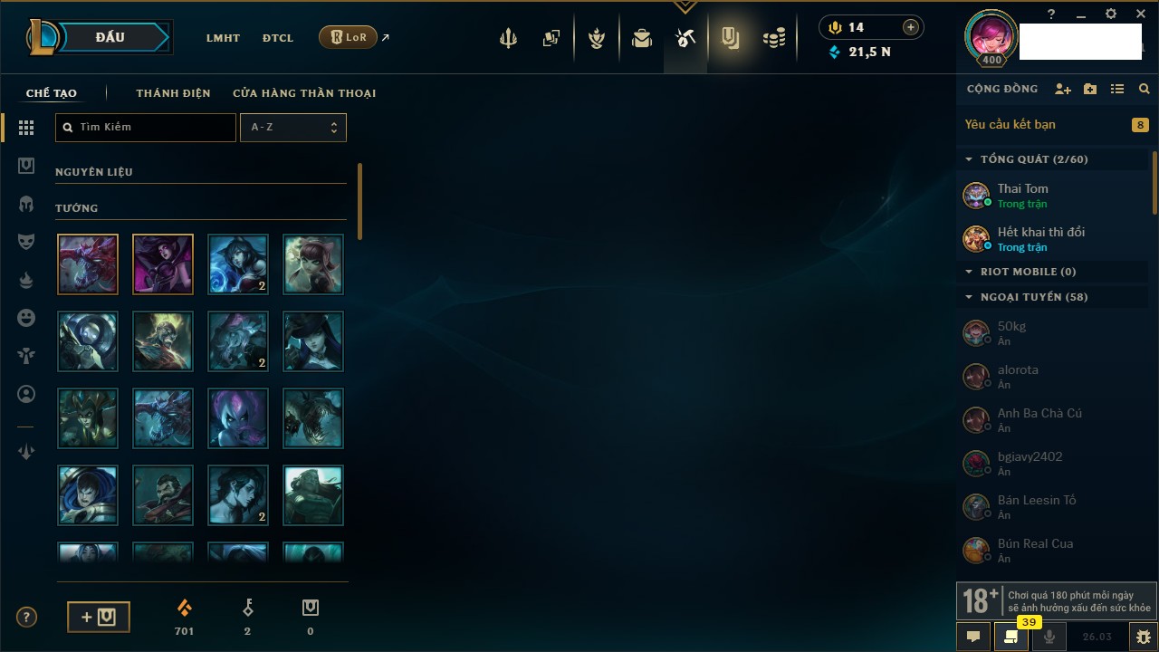 Rank Đơn: Chưa RankKhung: Chưa có khungTướng: 172 - Còn 137181 THXTrang Phục: 232Rank ĐTCL: Bạc IVLinh Thú: 130
