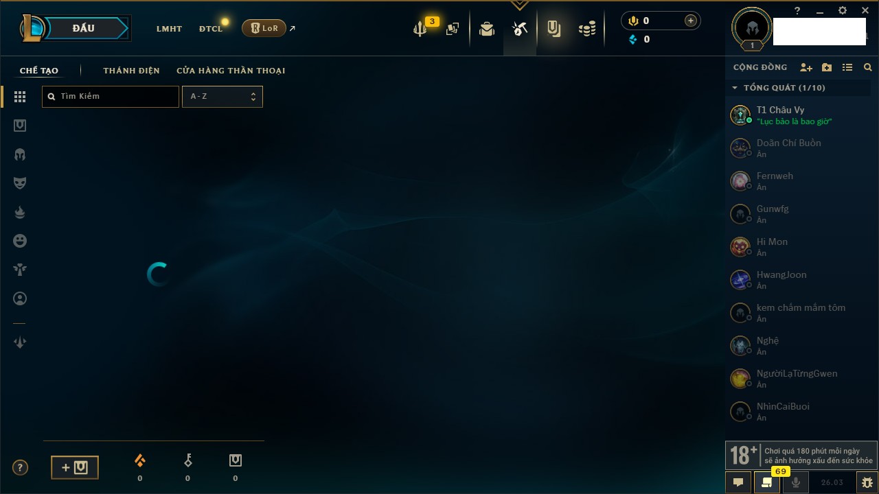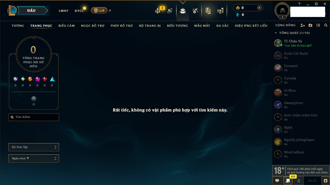 Rank Đơn: Chưa RankKhung: Chưa có khungTướng: 169 - Còn 43188 THXTrang Phục: 205Rank ĐTCL: Chưa RankLinh Thú: 259