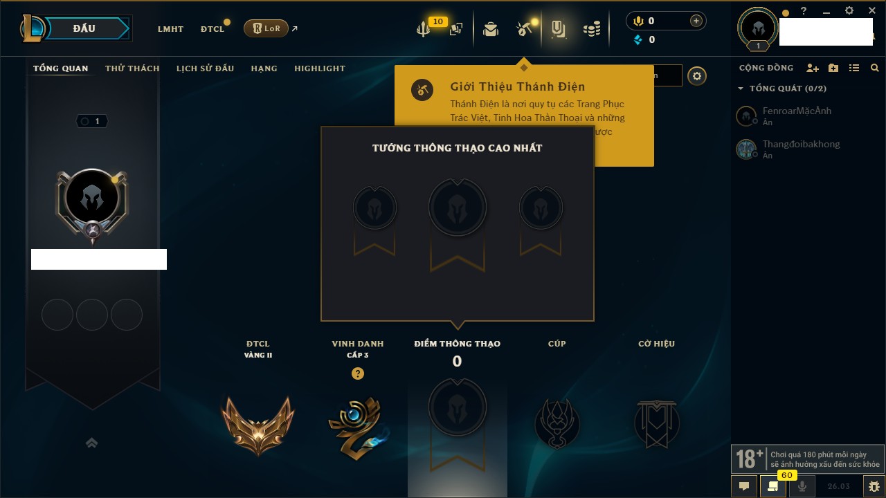Rank Đơn: Chưa rank mùa nàoKhung: Chưa có khungTướng: 0 - Còn 2000 THXTrang Phục: 0Rank ĐTCL: Chưa rank mùa nàoLinh Thú: 15
