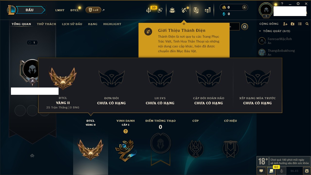 Rank Đơn: Chưa rank mùa nàoKhung: Chưa có khungTướng: 0 - Còn 5500 THXTrang Phục: 0Rank ĐTCL: Chưa rank mùa nàoLinh Thú: 8
