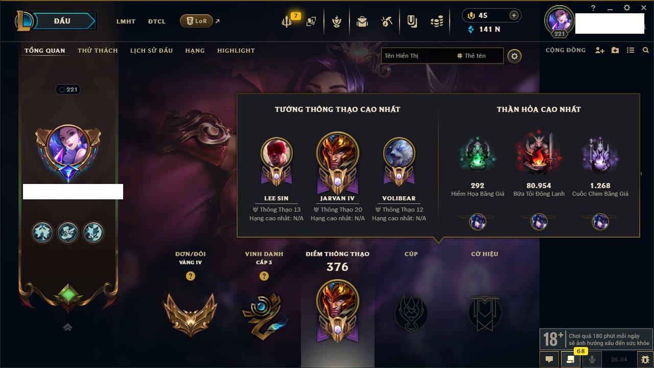 Rank Đơn: Chưa RankKhung: Bạch kimTướng: 172 - Còn 867 THXTrang Phục: 242Rank ĐTCL: Chưa RankLinh Thú: 162