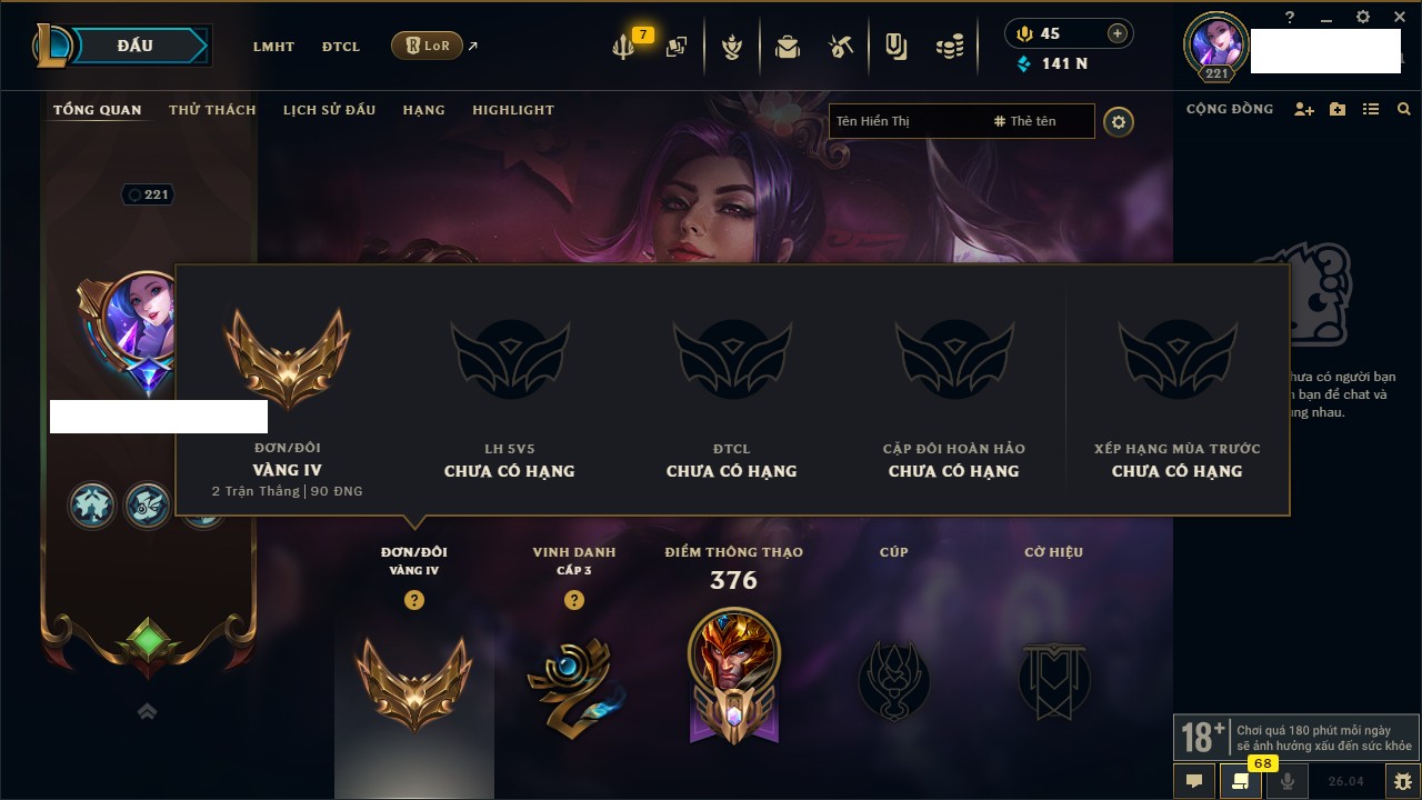 Rank Đơn: Vàng IVKhung: Chưa có khungTướng: 172 - Còn 32629 THXTrang Phục: 220Rank ĐTCL: Chưa RankLinh Thú: 38