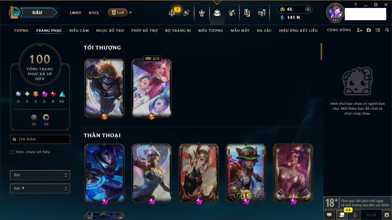 Rank Đơn: Chưa RankKhung: Chưa có khungTướng: 171 - Còn 414006 THXTrang Phục: 207Rank ĐTCL: Chưa RankLinh Thú: 55