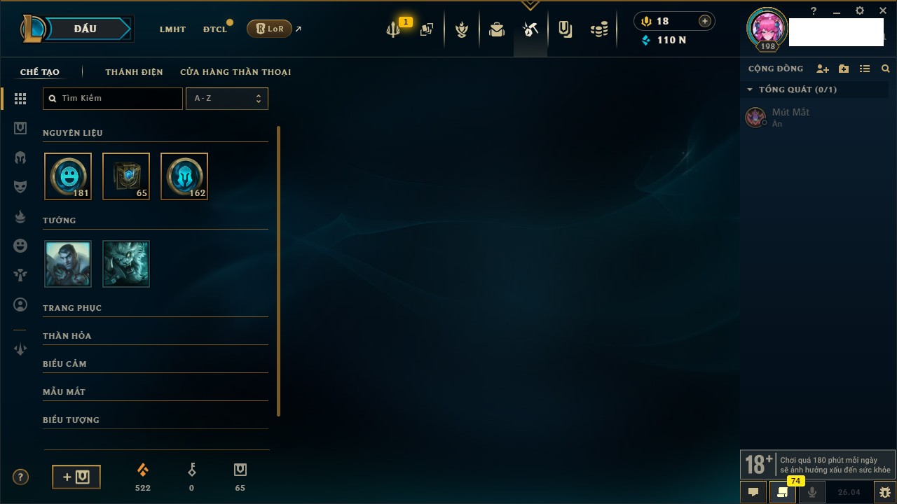 Rank Đơn: Chưa Rank Khung: Chưa có khung Tướng: 165 - Còn 1609 THX Trang Phục: 25 Rank ĐTCL: Chưa Rank Linh Thú: 44