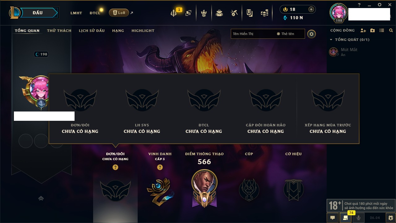 Rank Đơn: Đồng IV Khung: Chưa có khung Tướng: 172 - Còn 29179 THX Trang Phục: 390 Rank ĐTCL: Chưa Rank Linh Thú: 169