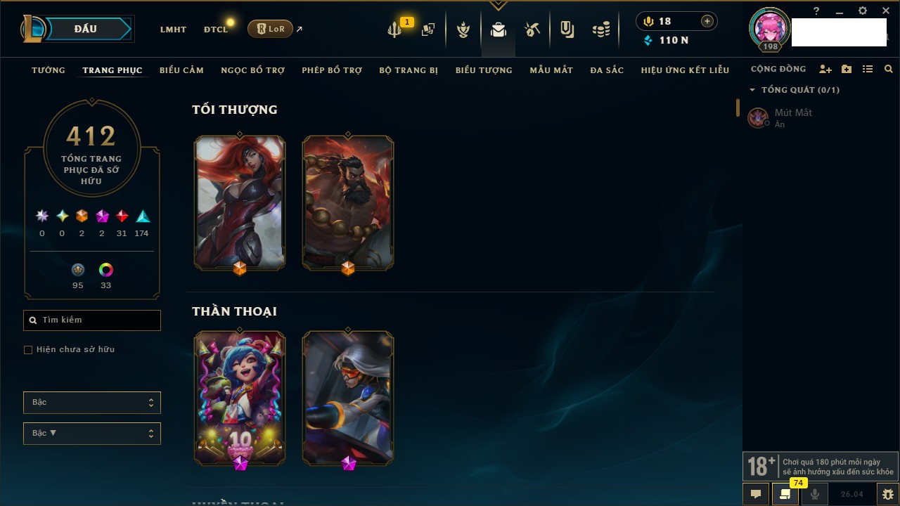 Rank Đơn: Chưa Rank Khung: Chưa có khung Tướng: 172 - Còn 110035 THX Trang Phục: 412 Rank ĐTCL: Chưa Rank Linh Thú: 391
