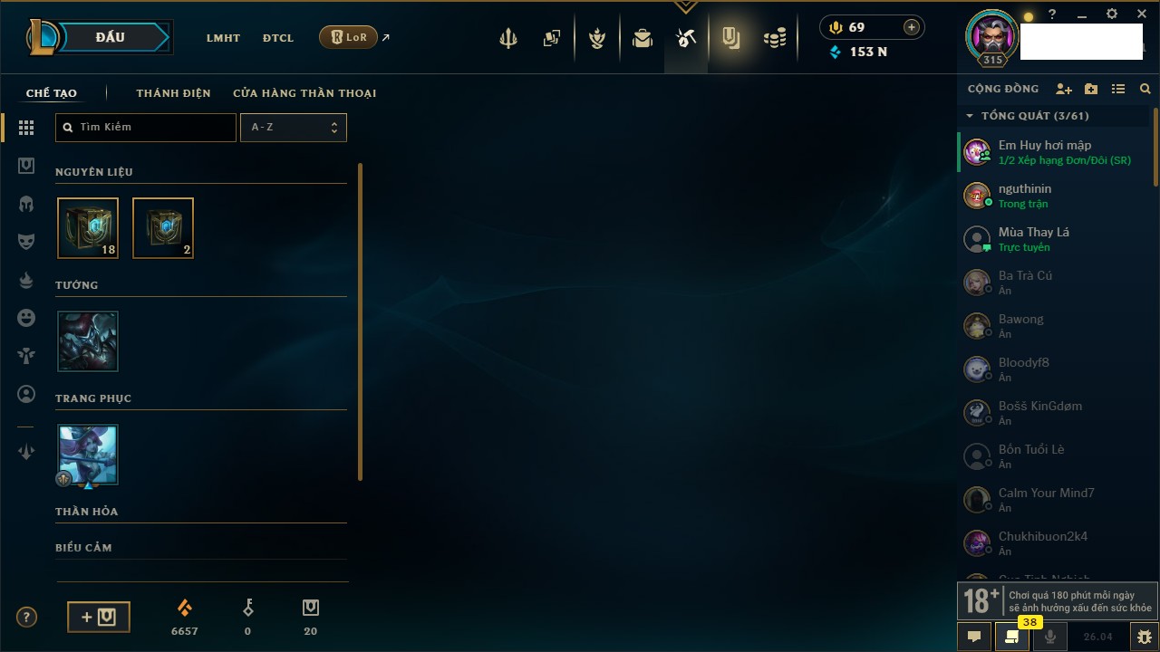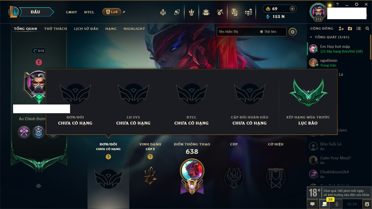 Rank Đơn: Chưa Rank Khung: Bạch kim Tướng: 171 - Còn 153818 THX Trang Phục: 141 Rank ĐTCL: Chưa Rank Linh Thú: 105