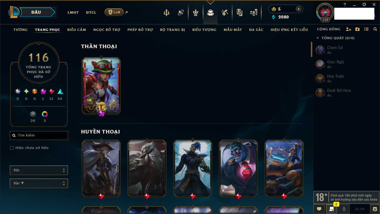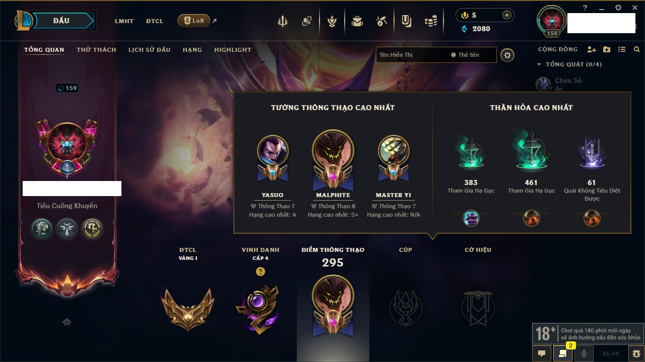 Rank Đơn: Bạc IIIKhung: Chưa có khungTướng: 162 - Còn 15053 THXTrang Phục: 181Rank ĐTCL: Chưa RankLinh Thú: 64