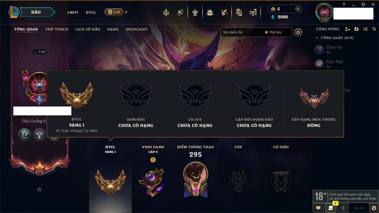 Rank Đơn: Đồng IVKhung: Chưa có khungTướng: 172 - Còn 91697 THXTrang Phục: 176Rank ĐTCL: Đồng IIILinh Thú: 39
