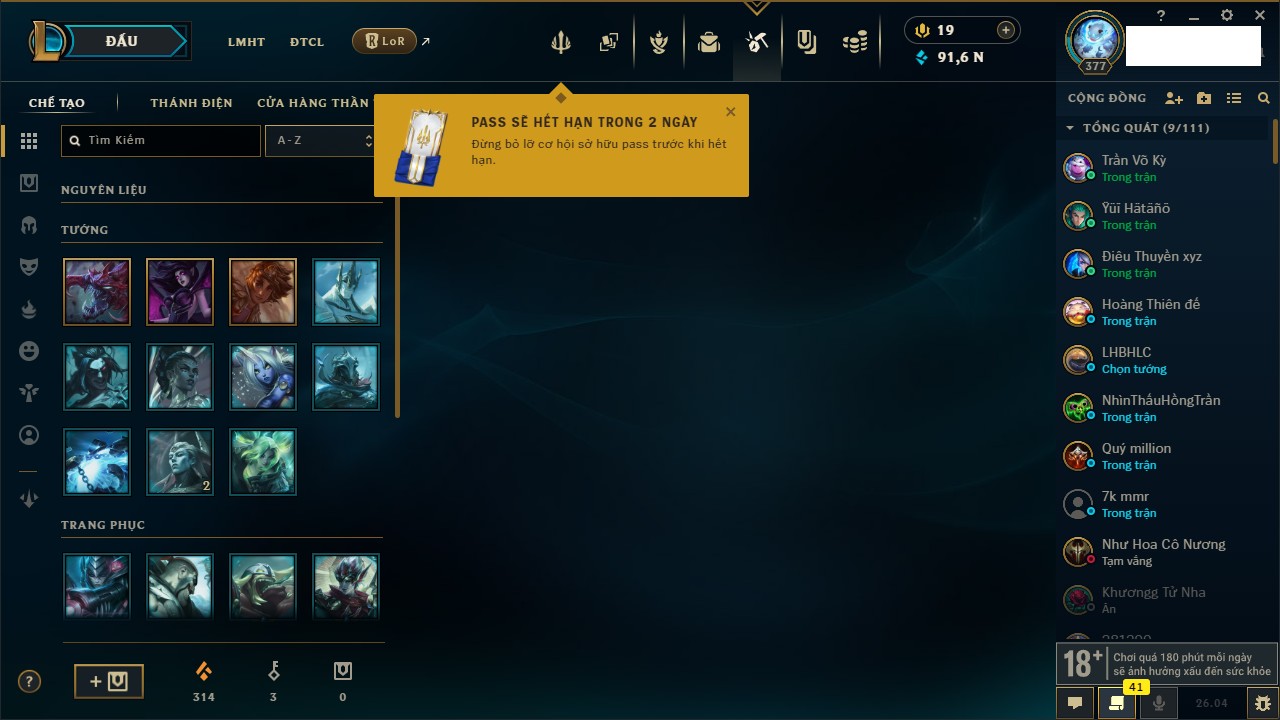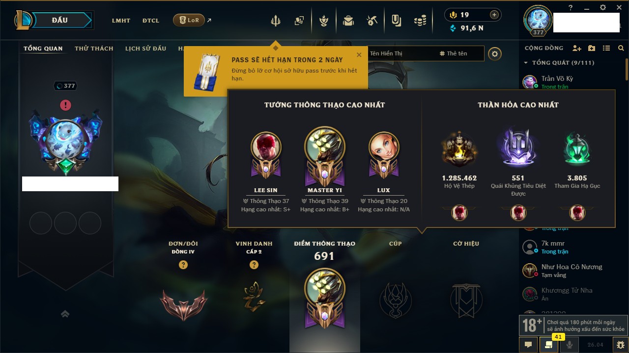 Rank Đơn: Bạc IIIKhung: VàngTướng: 172 - Còn 40397 THXTrang Phục: 184Rank ĐTCL: Chưa RankLinh Thú: 130