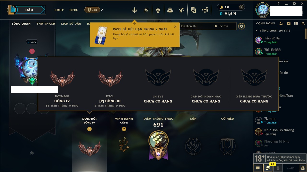 Rank Đơn: Đồng IVKhung: Chưa có khungTướng: 172 - Còn 91697 THXTrang Phục: 176Rank ĐTCL: Đồng IIILinh Thú: 39