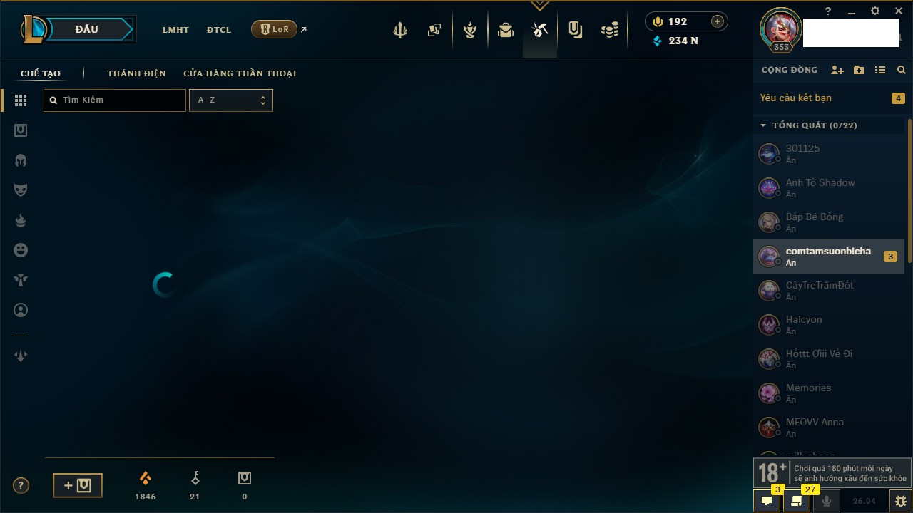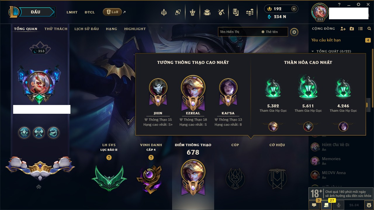 Rank Đơn: Chưa RankKhung: Chưa có khungTướng: 171 - Còn 827961 THXTrang Phục: 193Rank ĐTCL: Chưa RankLinh Thú: 63