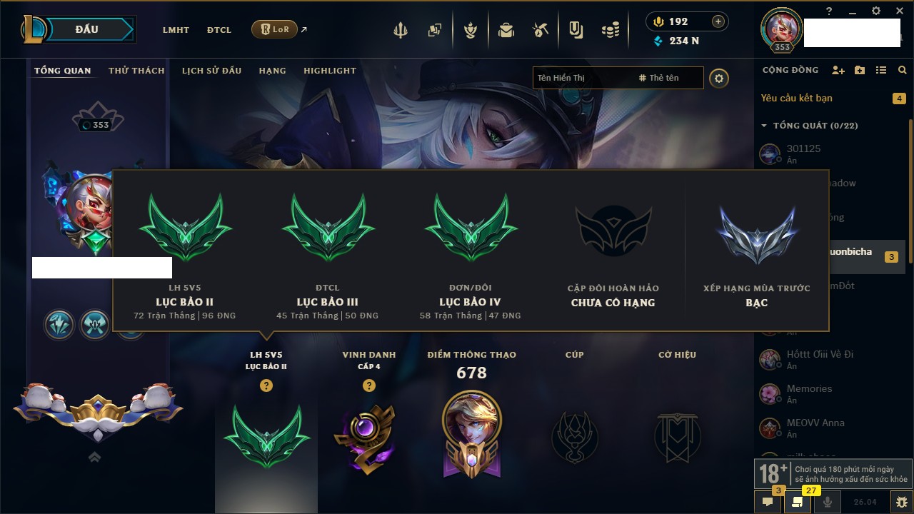 Rank Đơn: Lục Bảo IVKhung: BạcTướng: 172 - Còn 234988 THXTrang Phục: 232Rank ĐTCL: Lục Bảo IIILinh Thú: 76