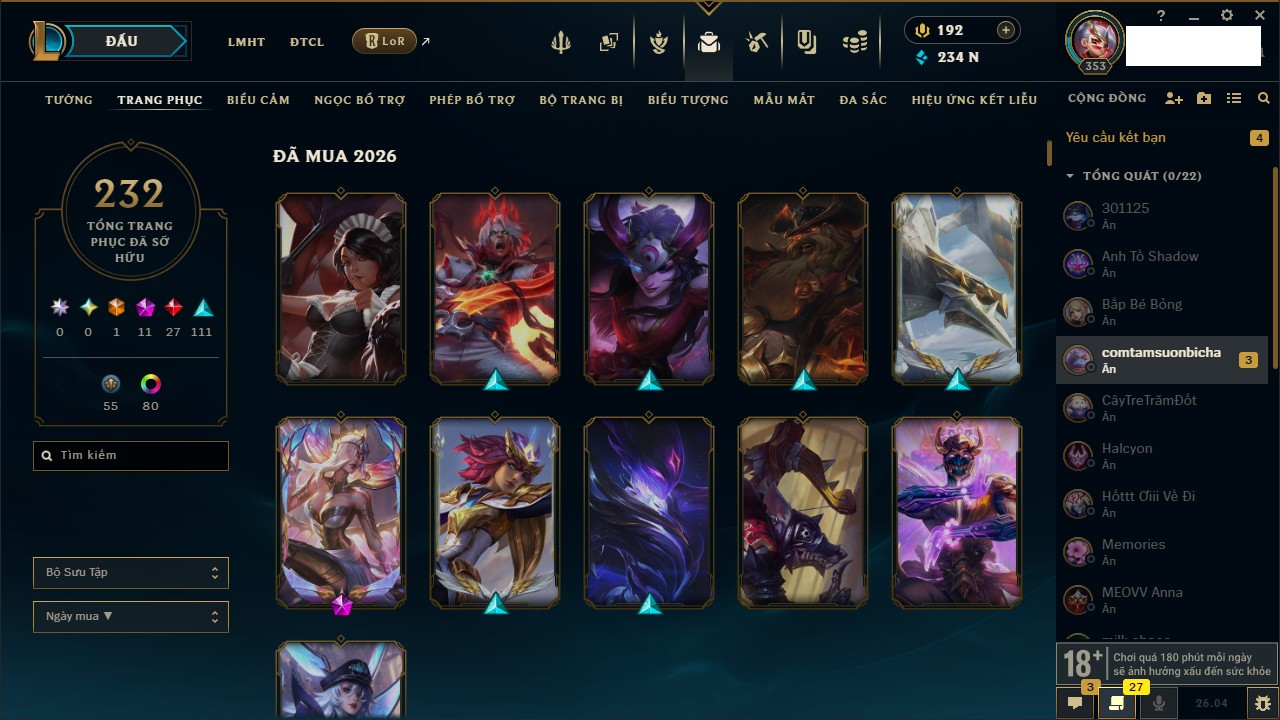 Rank Đơn: Chưa RankKhung: Chưa có khungTướng: 170 - Còn 42144 THXTrang Phục: 82Rank ĐTCL: Chưa RankLinh Thú: 130