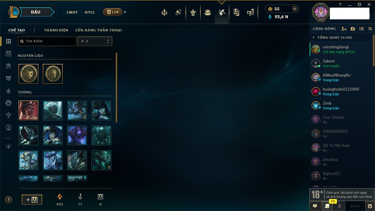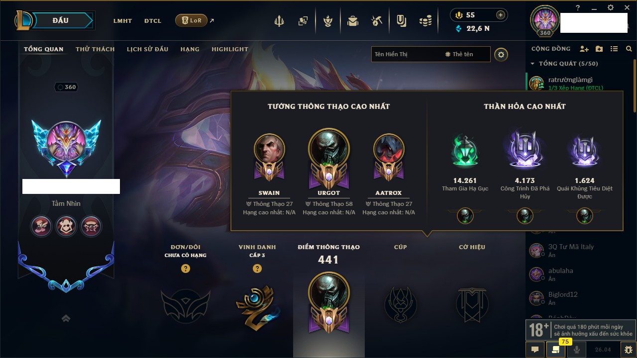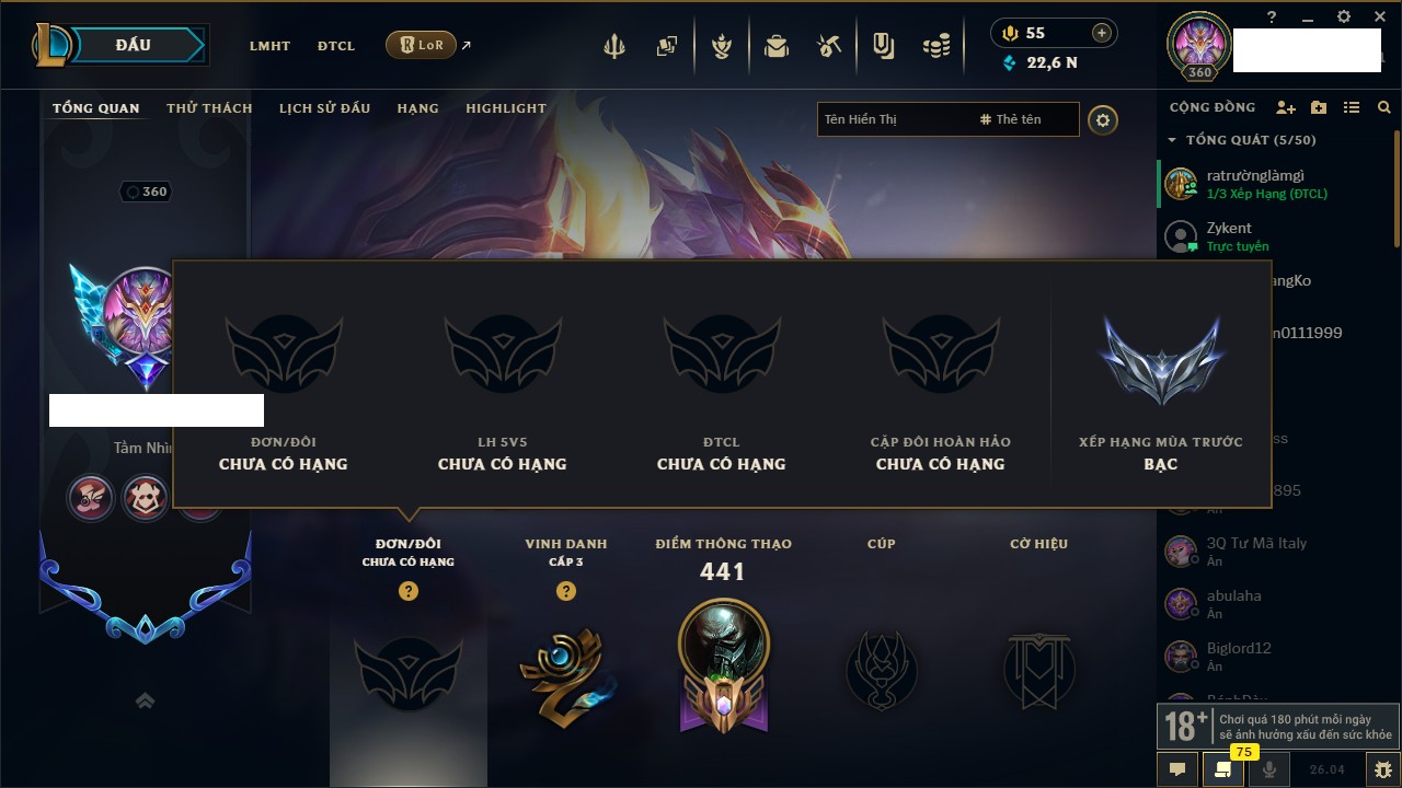 Rank Đơn: Chưa rank mùa nào Khung: Chưa có khung Tướng: 42 - Còn 5545 THX Trang Phục: 1 Rank ĐTCL: Chưa rank mùa nào Linh Thú: 23
