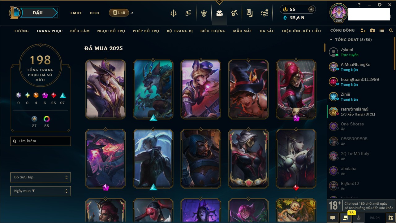 Rank Đơn: Chưa Rank Khung: Bạch kim Tướng: 171 - Còn 153818 THX Trang Phục: 141 Rank ĐTCL: Chưa Rank Linh Thú: 105