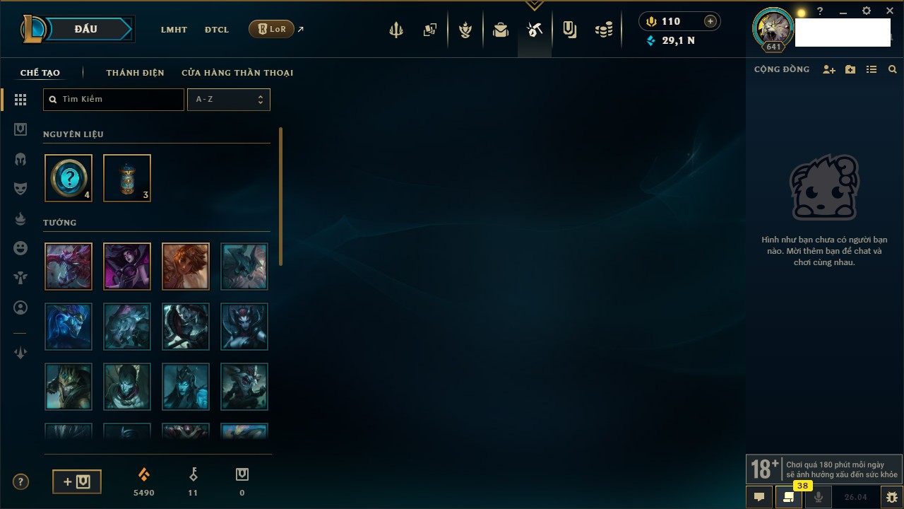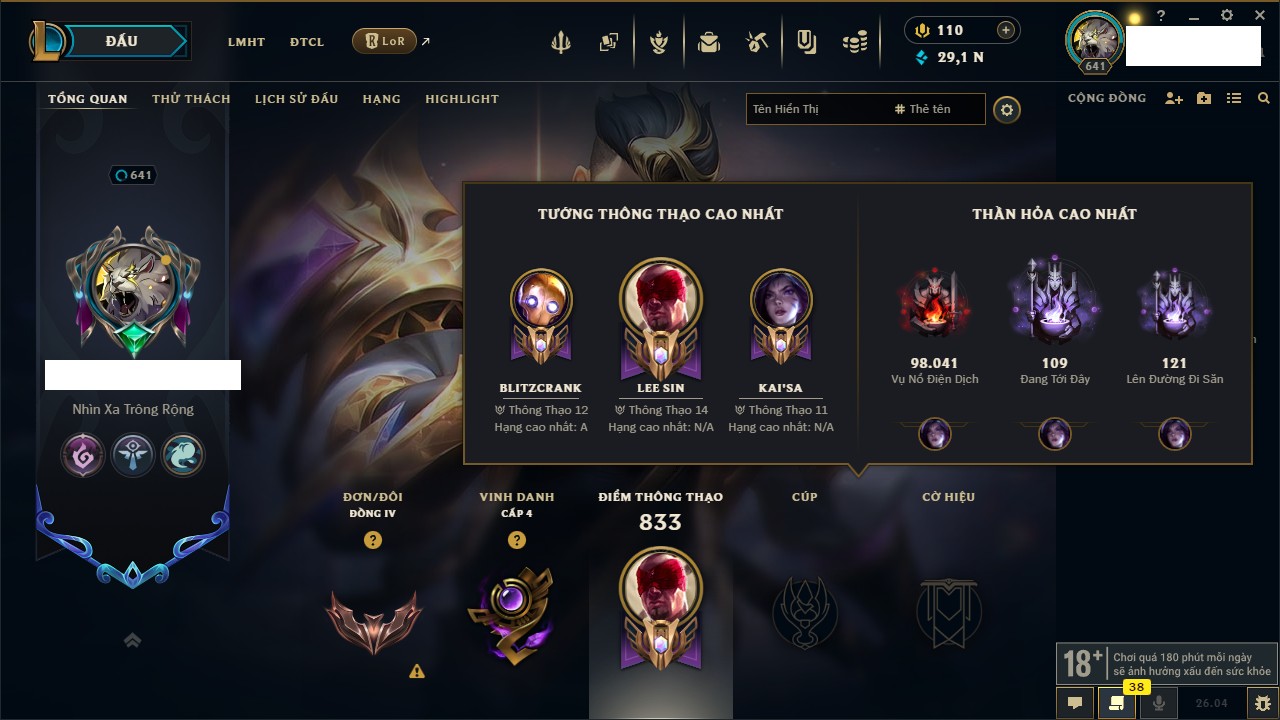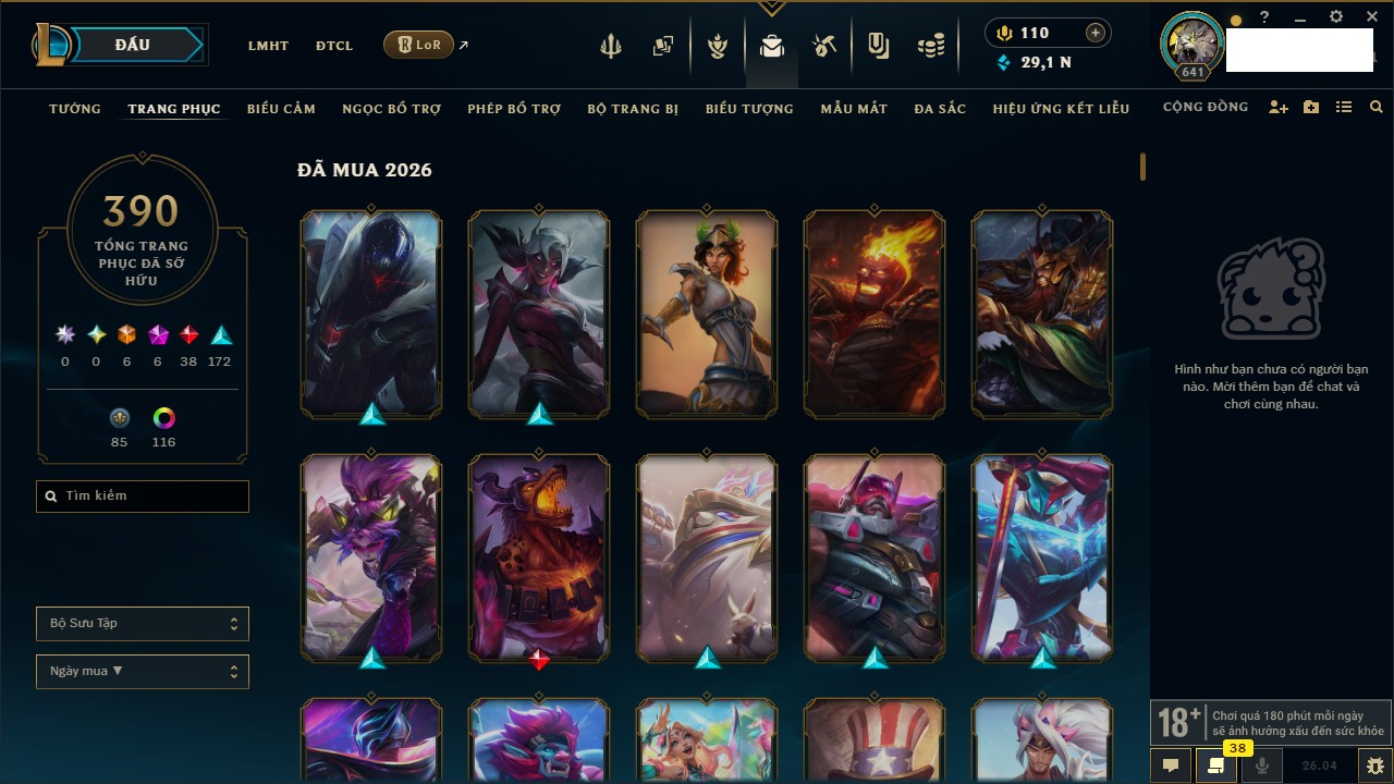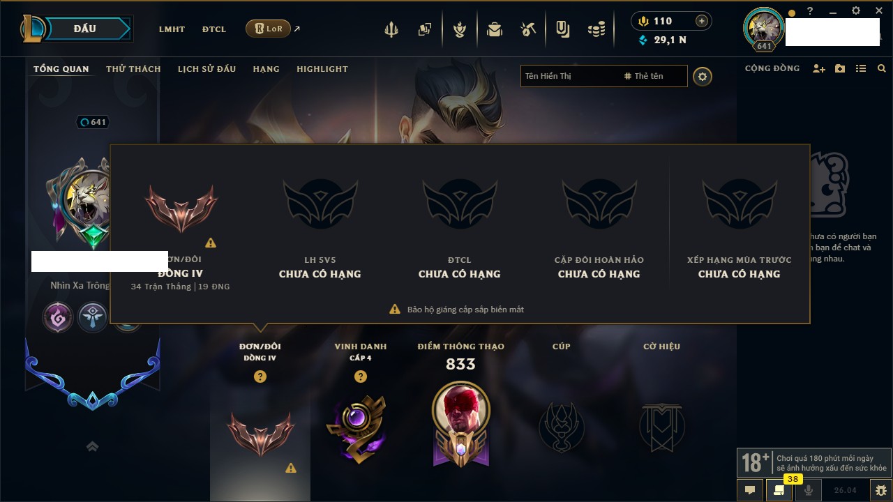 Rank Đơn: Đồng IV Khung: Chưa có khung Tướng: 172 - Còn 29179 THX Trang Phục: 390 Rank ĐTCL: Chưa Rank Linh Thú: 169