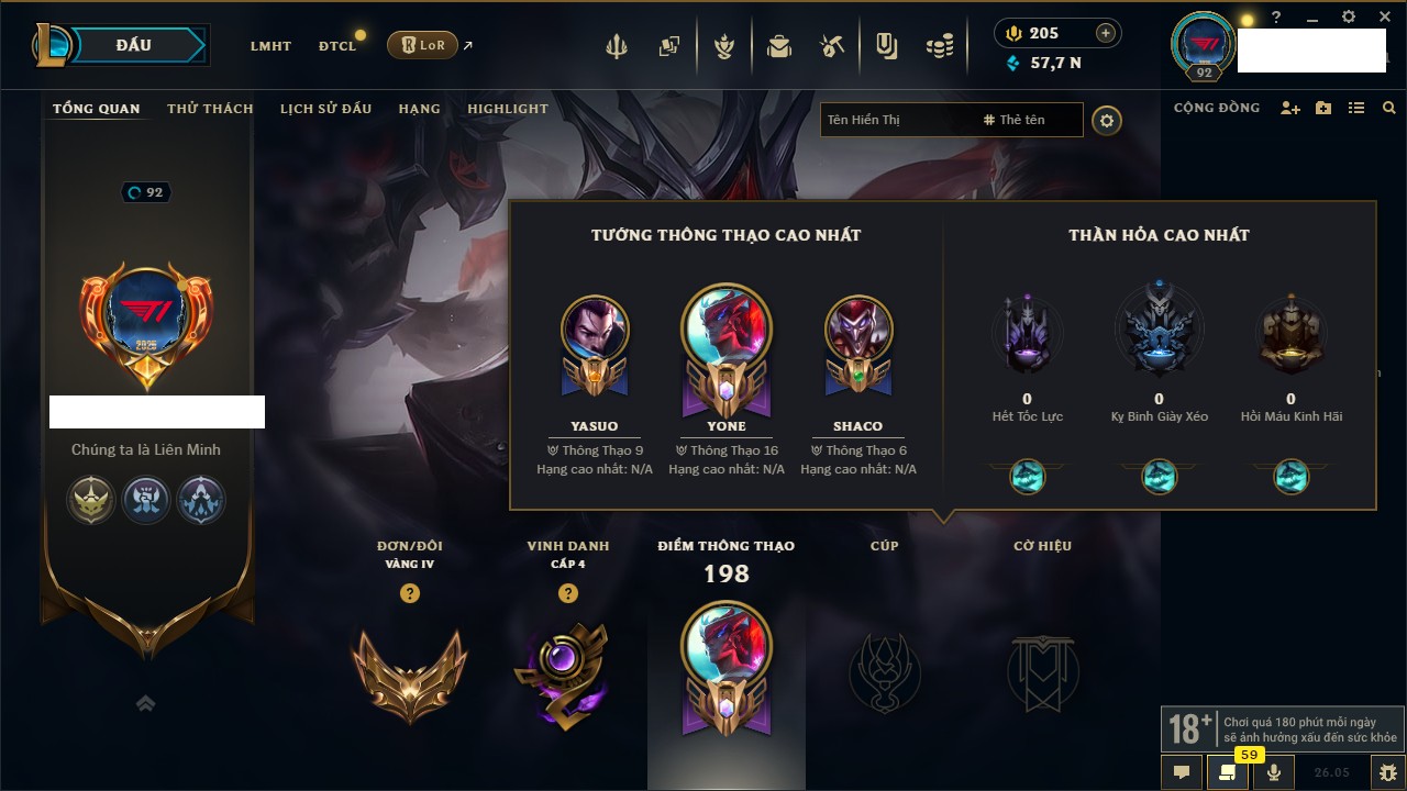 Rank Đơn: Chưa Rank Khung: Bạch kim Tướng: 171 - Còn 153818 THX Trang Phục: 141 Rank ĐTCL: Chưa Rank Linh Thú: 105
