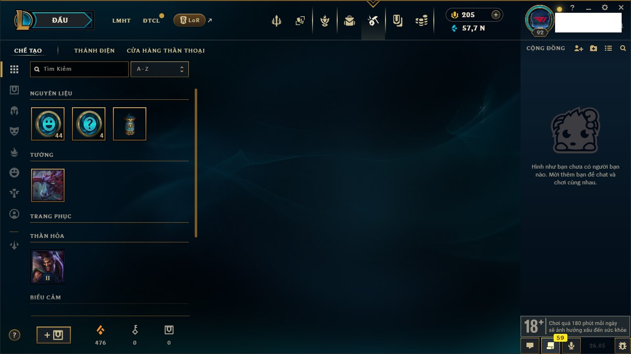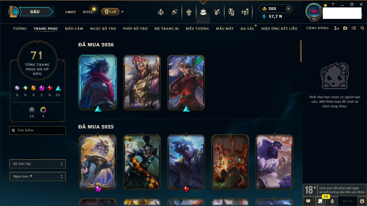 Rank Đơn: Chưa rank mùa nào Khung: Chưa có khung Tướng: 38 - Còn 6065 THX Trang Phục: 7 Rank ĐTCL: Chưa rank mùa nào Linh Thú: 130