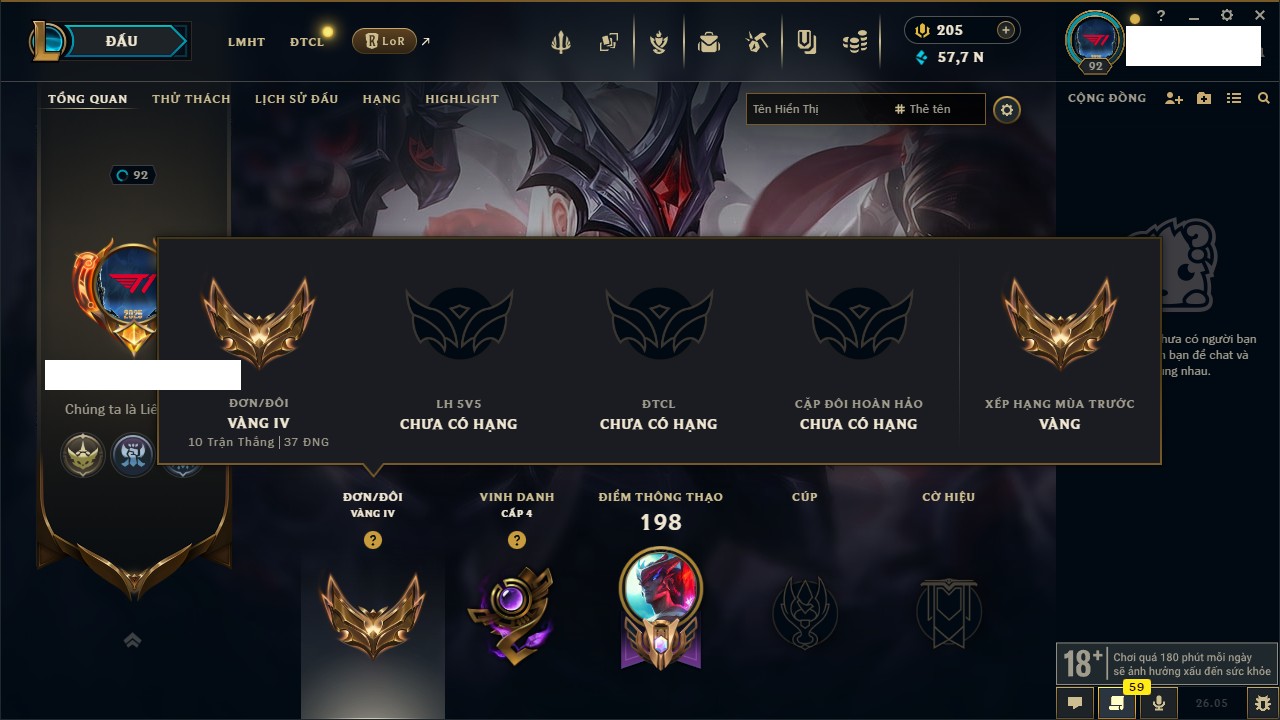 Rank Đơn: Vàng IV Khung: Vàng Tướng: 129 - Còn 57703 THX Trang Phục: 71 Rank ĐTCL: Chưa Rank Linh Thú: 71