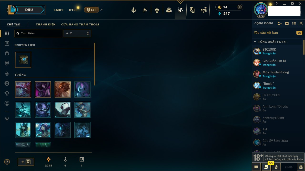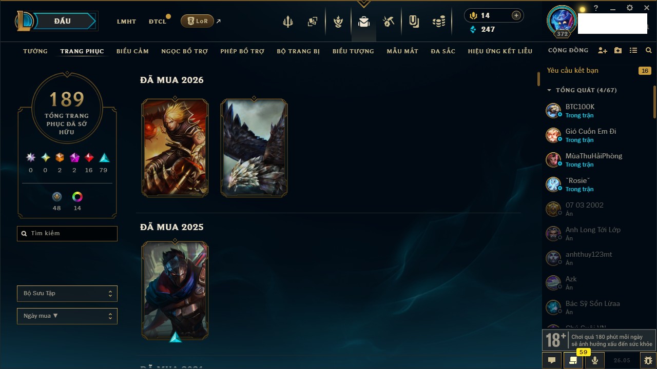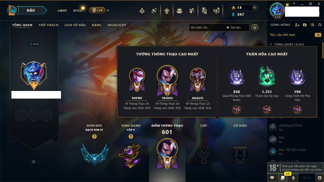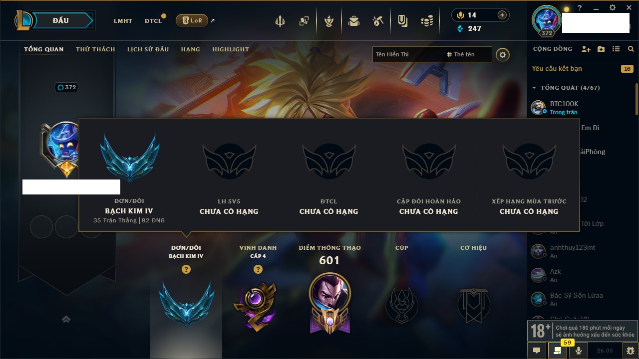 Rank Đơn: Chưa RankKhung: Bạch kimTướng: 171 - Còn 121609 THXTrang Phục: 203Rank ĐTCL: Chưa RankLinh Thú: 55