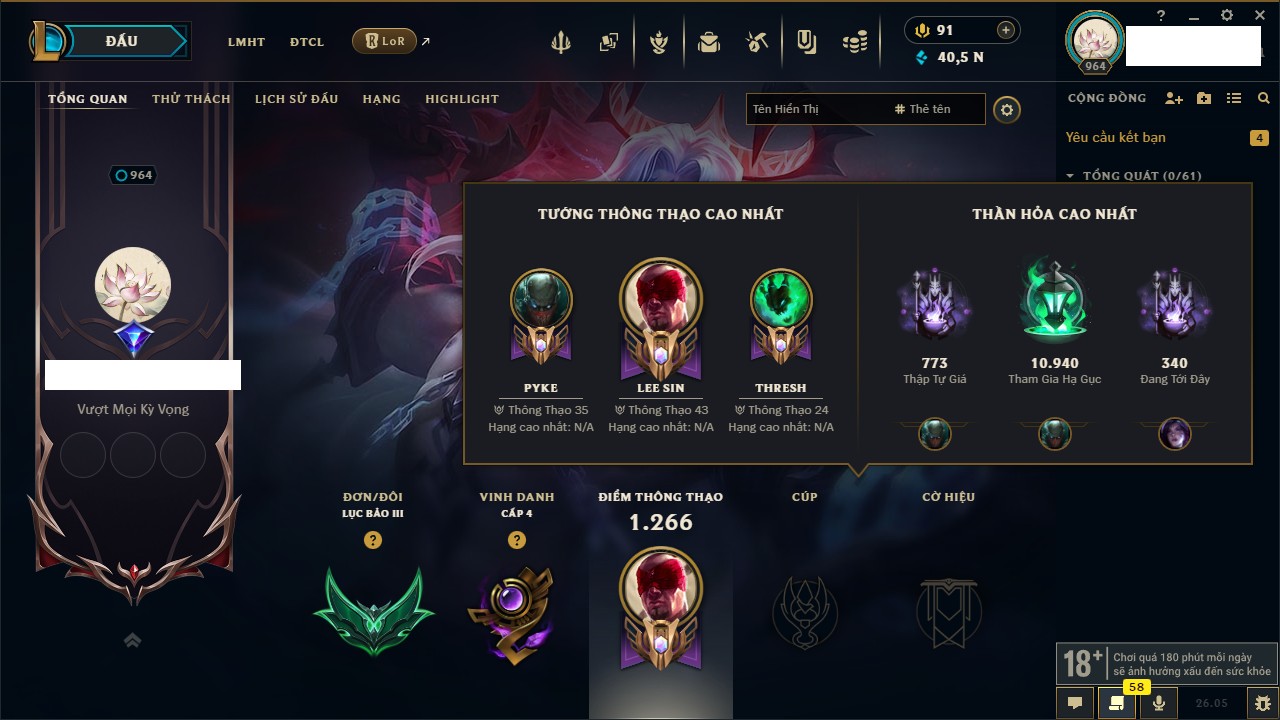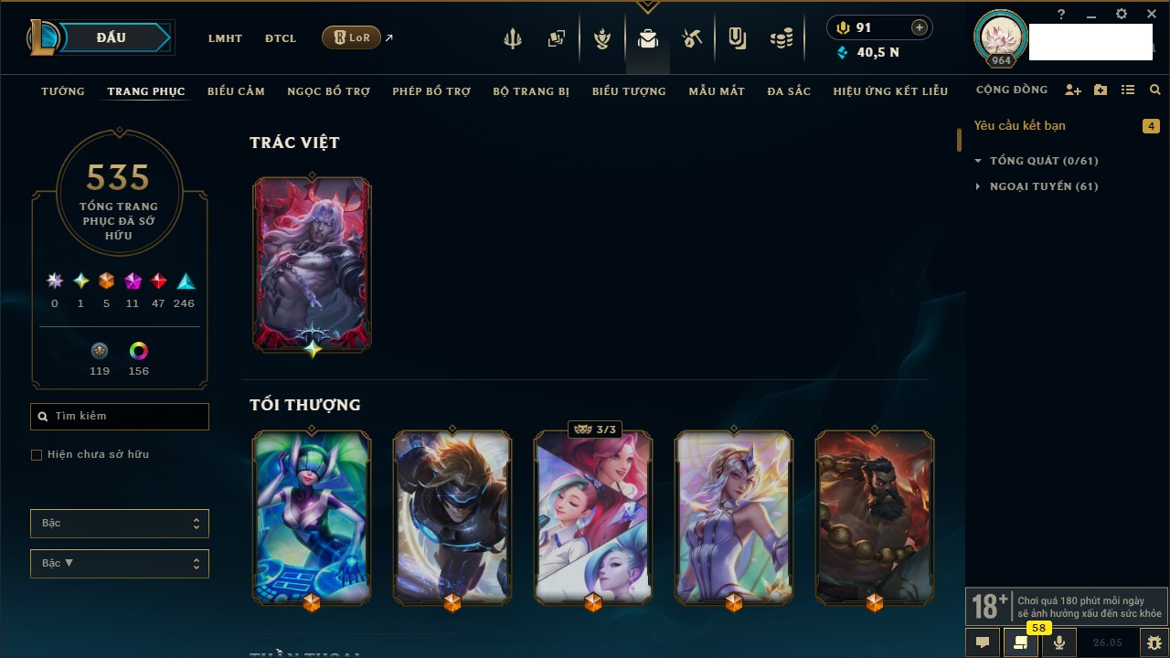 Rank Đơn: Chưa Rank Khung: Chưa có khung Tướng: 170 - Còn 11244 THX Trang Phục: 838 Rank ĐTCL: Chưa Rank Linh Thú: 508