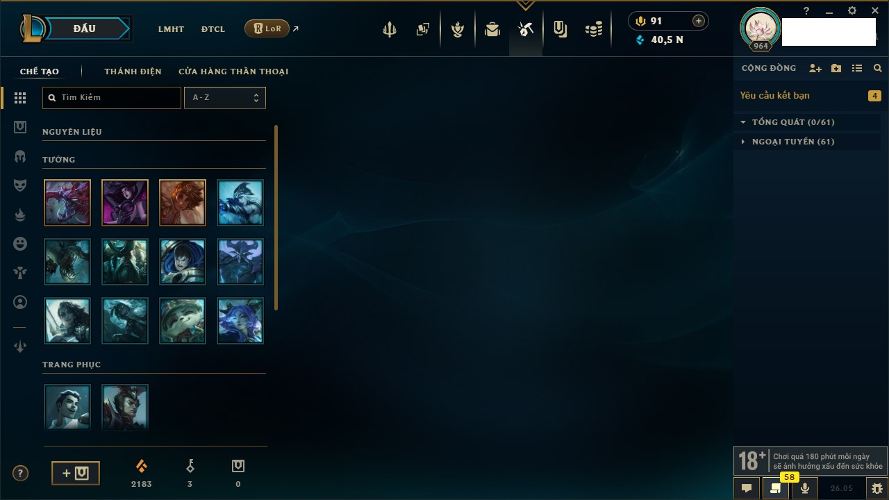 Rank Đơn: Chưa Rank Khung: Chưa có khung Tướng: 169 - Còn 15524 THX Trang Phục: 175 Rank ĐTCL: Chưa Rank Linh Thú: 389