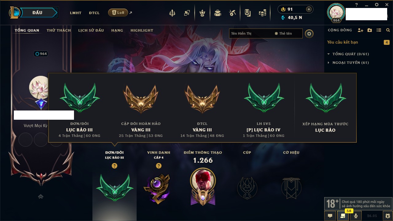 Rank Đơn: Chưa Rank Khung: Bạch kim Tướng: 170 - Còn 43042 THX Trang Phục: 41 Rank ĐTCL: Chưa Rank Linh Thú: 96