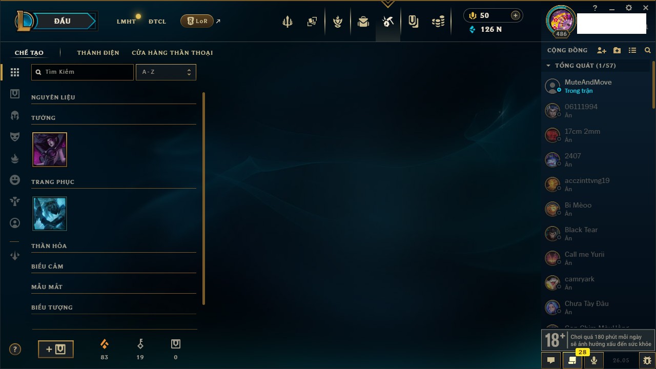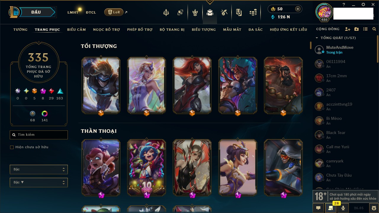 Rank Đơn: Chưa rank mùa nào Khung: Chưa có khung Tướng: 159 - Còn 34939 THX Trang Phục: 59 Rank ĐTCL: Chưa rank mùa nào Linh Thú: 325