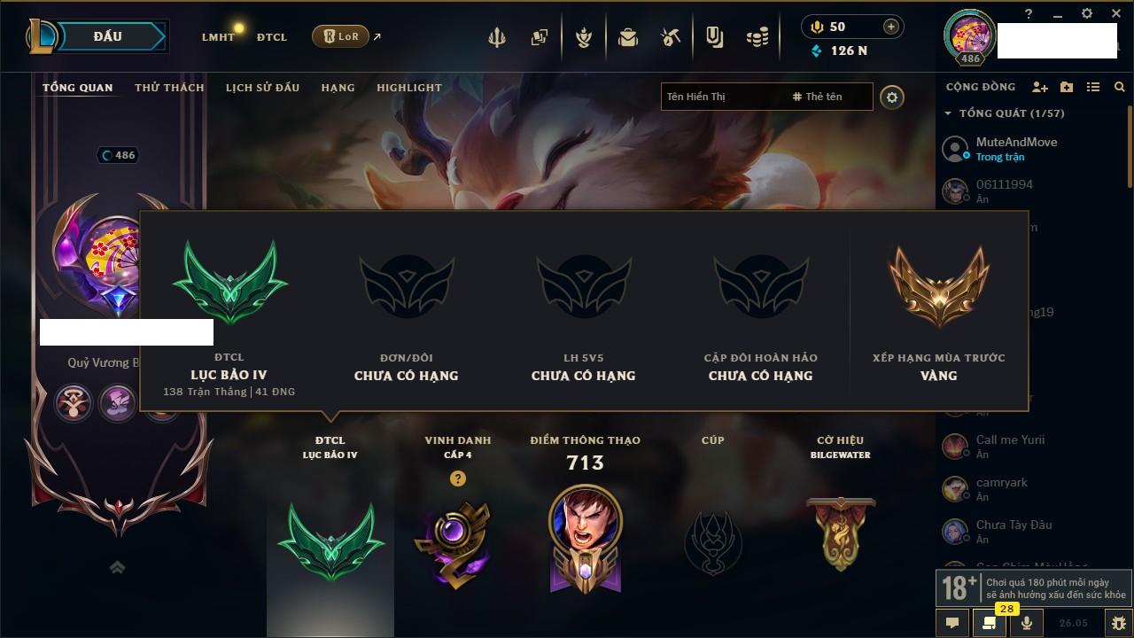 Rank Đơn: Đồng IV Khung: Chưa có khung Tướng: 172 - Còn 29179 THX Trang Phục: 390 Rank ĐTCL: Chưa Rank Linh Thú: 169