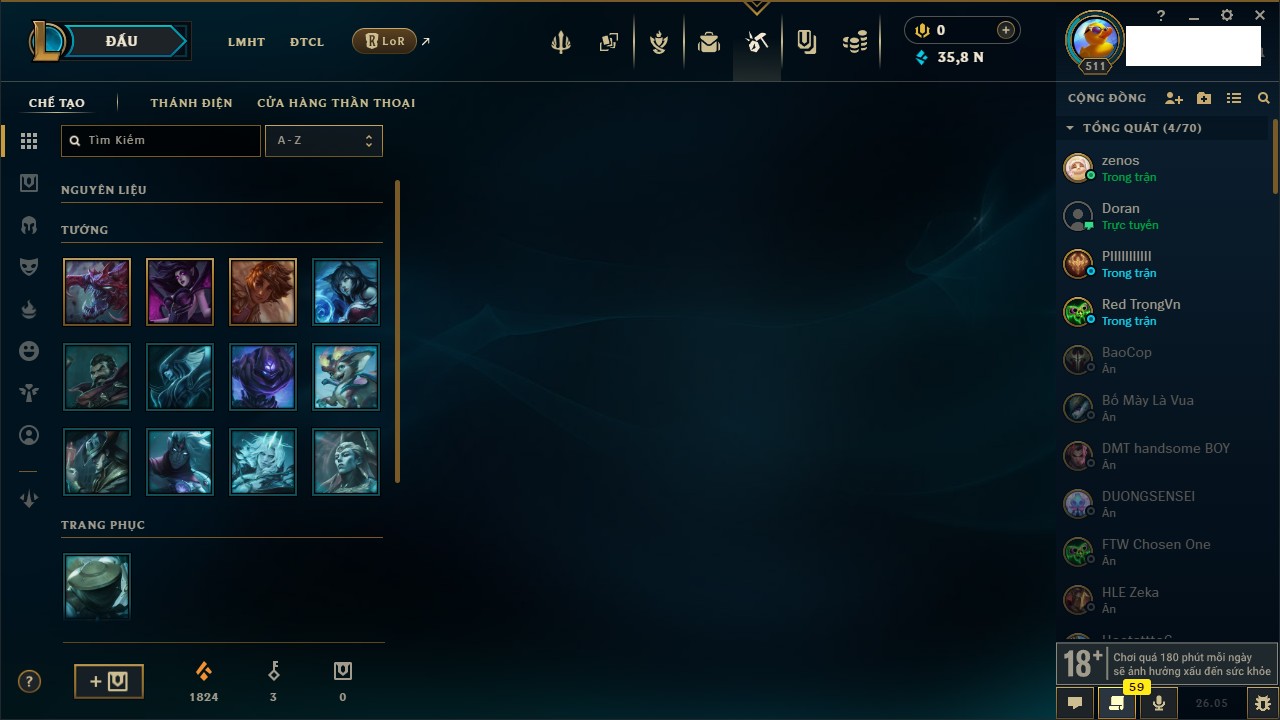 Rank Đơn: Chưa RankKhung: Chưa có khungTướng: 165 - Còn 65881 THXTrang Phục: 117Rank ĐTCL: Chưa RankLinh Thú: 97