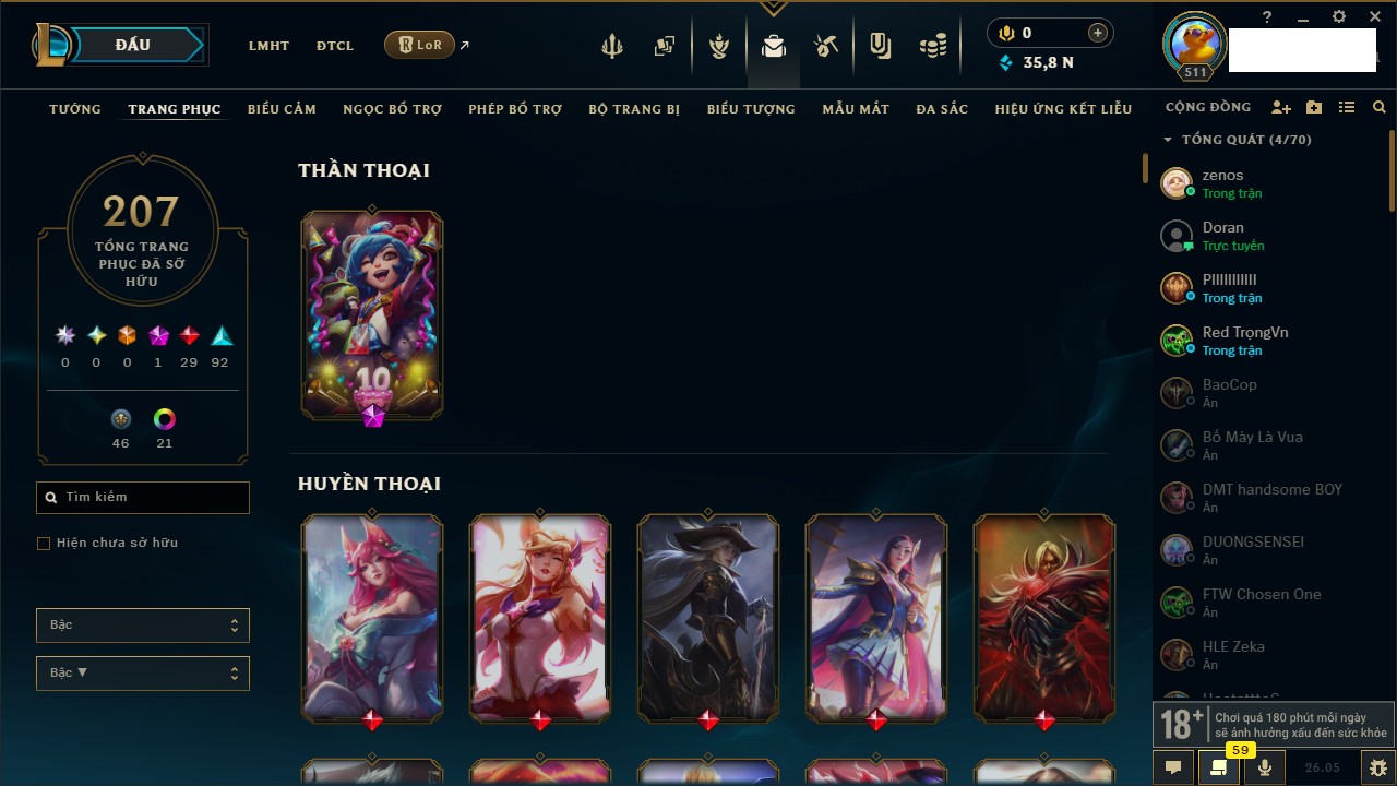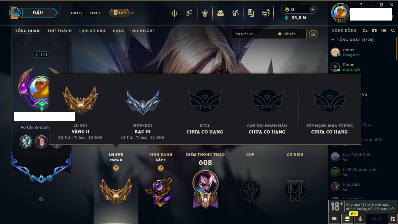Rank Đơn: Bạc IIIKhung: Chưa có khungTướng: 172 - Còn 35814 THXTrang Phục: 207Rank ĐTCL: Chưa RankLinh Thú: 107
