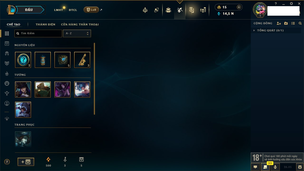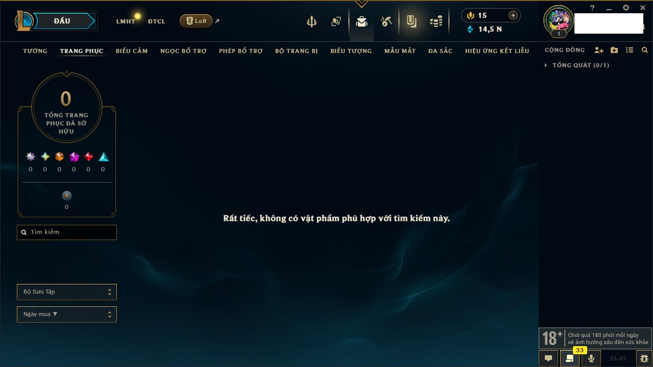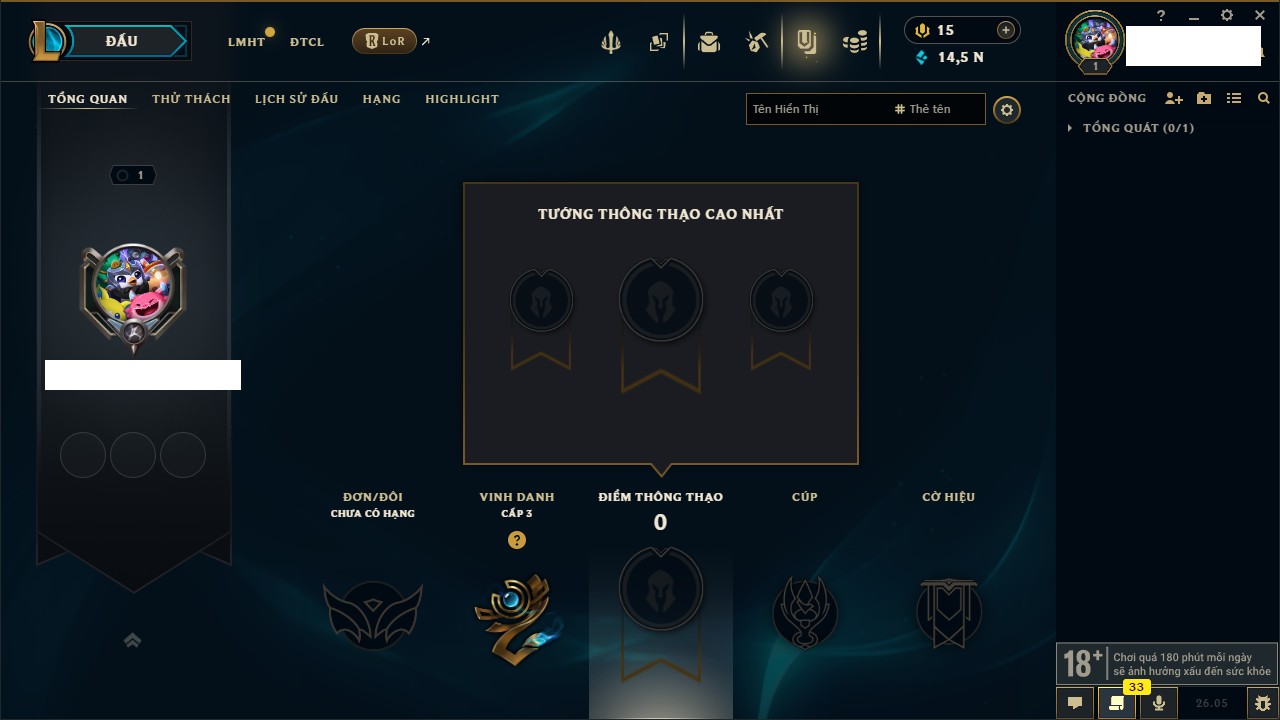 Rank Đơn: Chưa rank mùa nàoKhung: Chưa có khungTướng: 0 - Còn 14550 THXTrang Phục: 0Rank ĐTCL: Chưa RankLinh Thú: 50