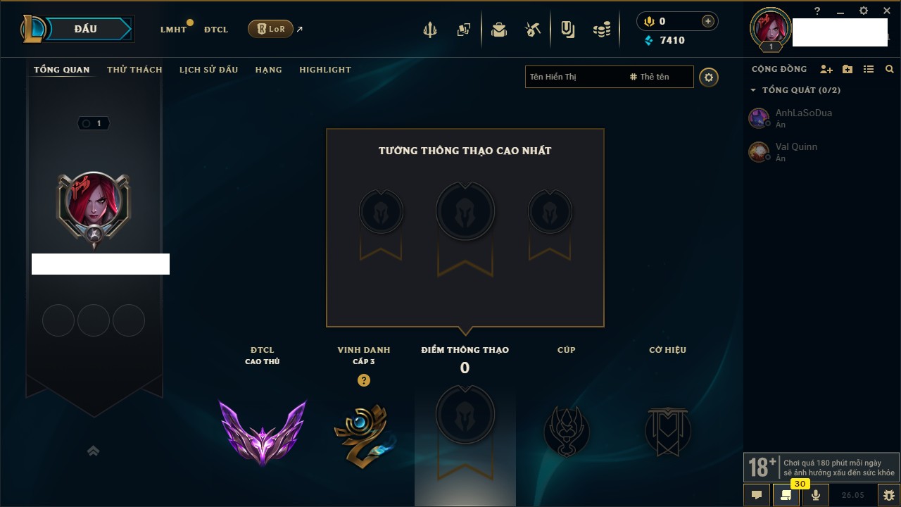 Rank Đơn: Chưa rank mùa nàoKhung: Chưa có khungTướng: 29 - Còn 2493 THXTrang Phục: 1Rank ĐTCL: Chưa rank mùa nàoLinh Thú: 1