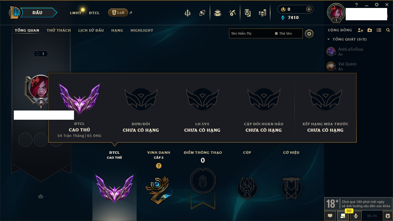 Rank Đơn: Chưa rank mùa nàoKhung: Chưa có khungTướng: 3 - Còn 7410 THXTrang Phục: 0Rank ĐTCL: Rank Cao ThủLinh Thú: 22