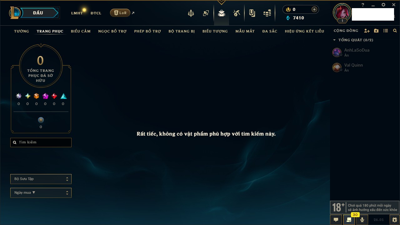 Rank Đơn: Chưa RankKhung: Chưa có khungTướng: 137 - Còn 21354 THXTrang Phục: 107Rank ĐTCL: Chưa RankLinh Thú: 31