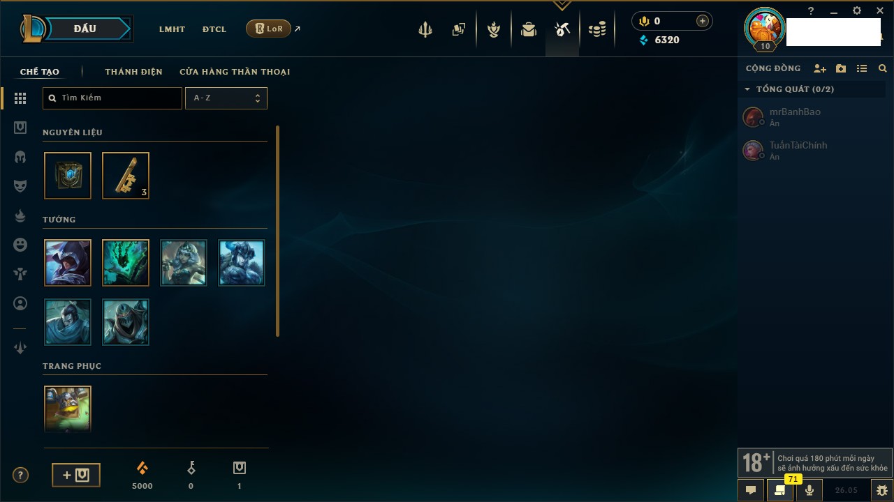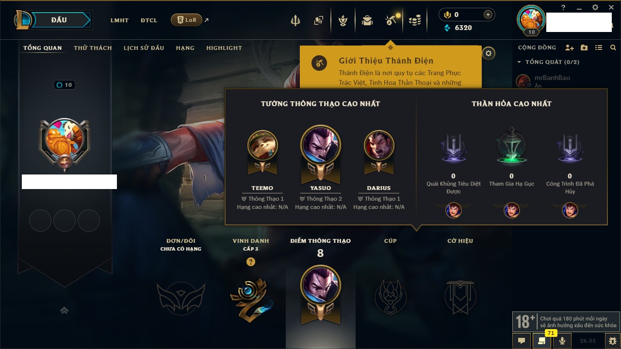 Rank Đơn: Chưa rank mùa nàoKhung: Chưa có khungTướng: 27 - Còn 2900 THXTrang Phục: 4Rank ĐTCL: Chưa RankLinh Thú: 24