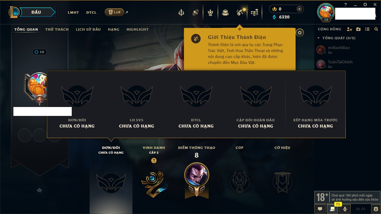 Rank Đơn: Chưa rank mùa nàoKhung: Chưa có khungTướng: 27 - Còn 1671 THXTrang Phục: 5Rank ĐTCL: Chưa RankLinh Thú: 6