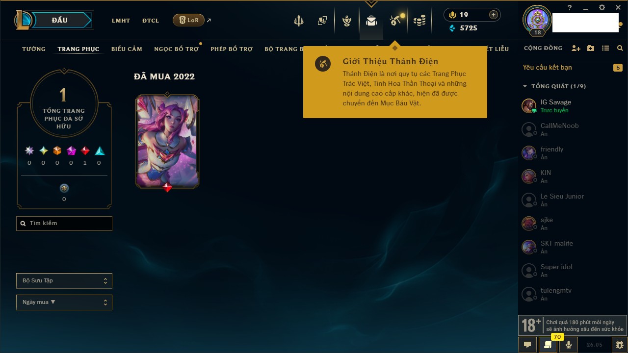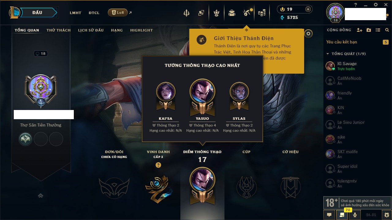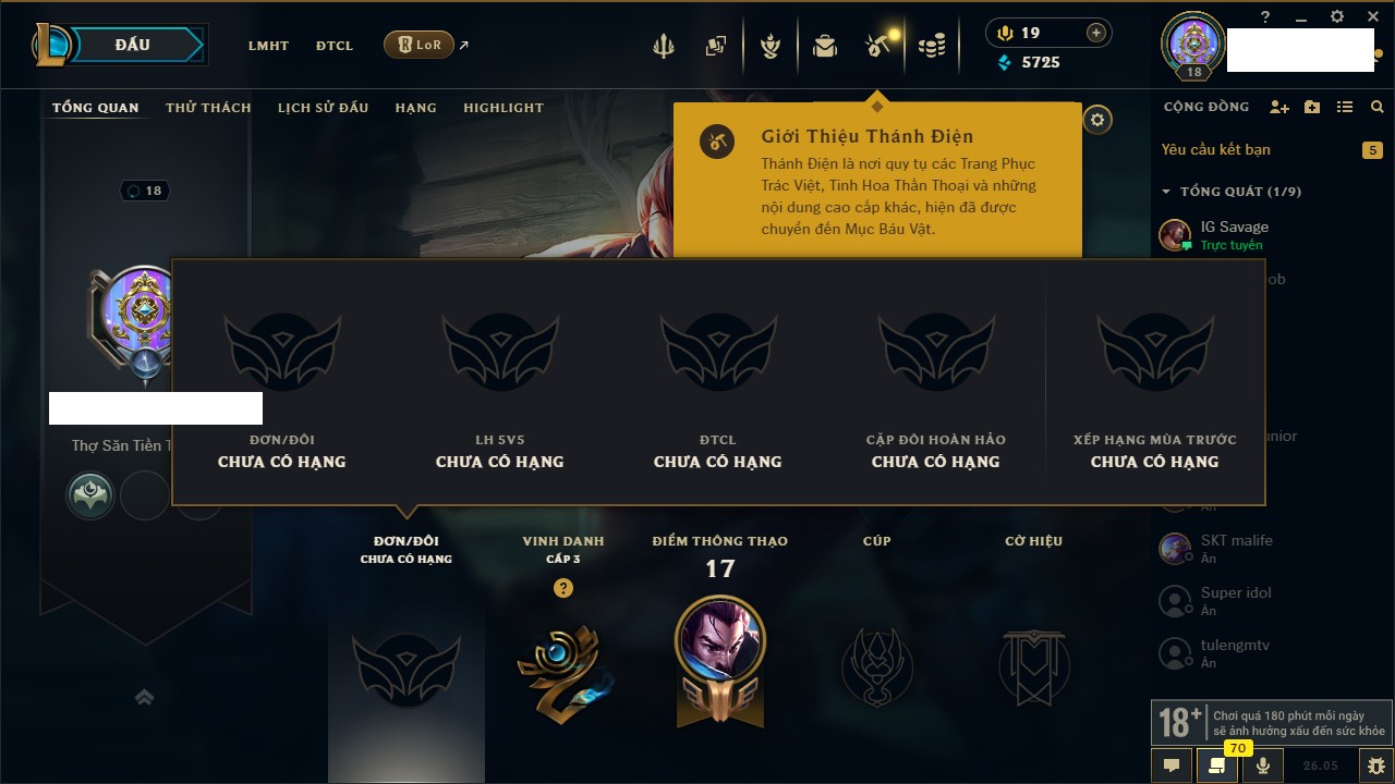 Rank Đơn: Chưa rank mùa nàoKhung: Chưa có khungTướng: 92 - Còn 16890 THXTrang Phục: 0Rank ĐTCL: Chưa RankLinh Thú: 8